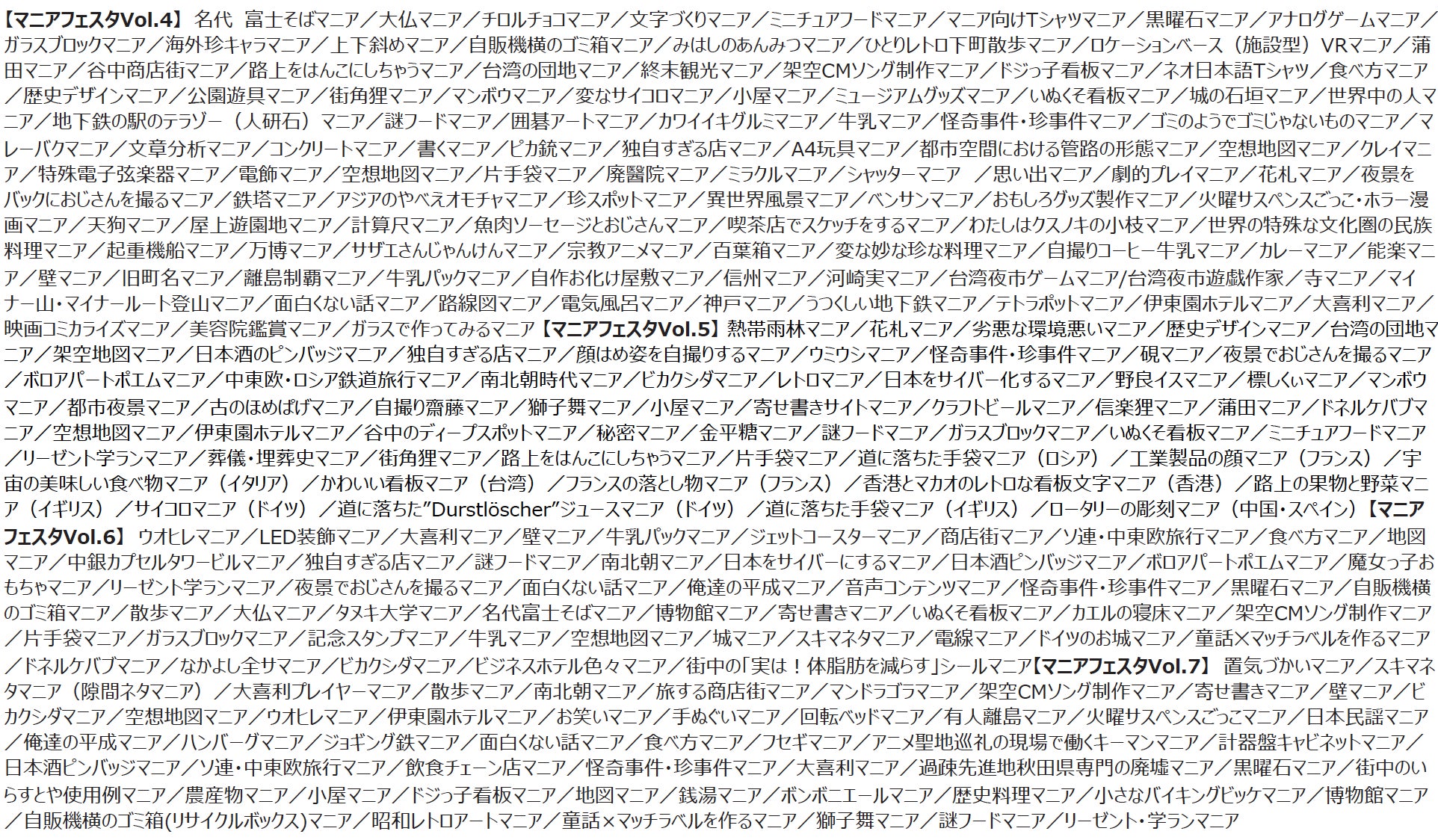 マニアフェスタは、「片手袋マニア」「空想地図マニア」「CMソング制作マニア」など、多種多様なジャンルのマニアや研究者、専門店が出展する展示即売会です。日頃の研究成果を詰め込んだ同人誌や専門グッズをその場で購入できるマーケット機能を果たし、マニアの創造・表現の場を創出しています。