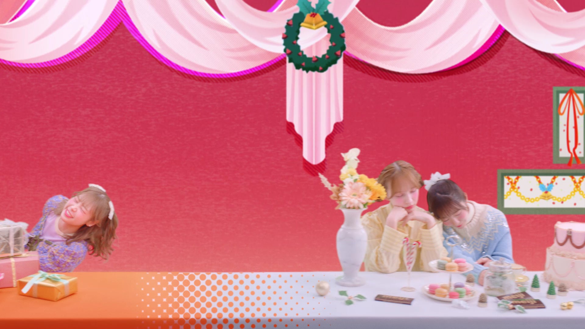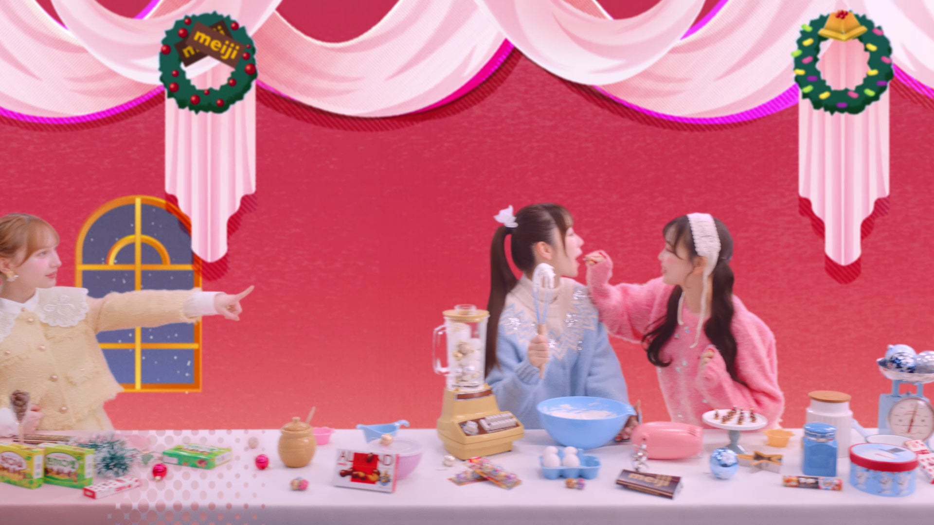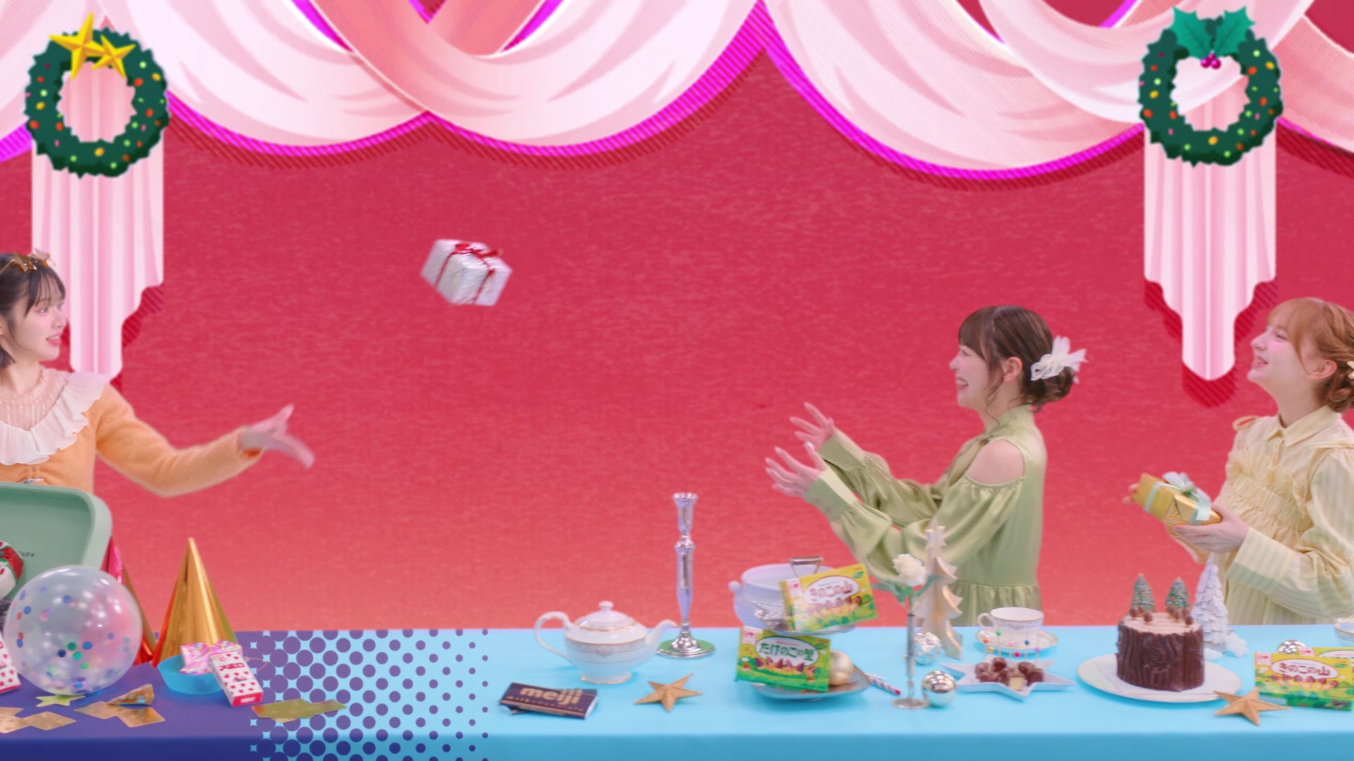 鎮西さんの「クリスマス始まるよ!」という明るい呼びかけから、WebCMはスタート。明治のおかしが色とりどりに机に並ぶクリスマスパーティー会場にFRUITS ZIPPERのメンバーが入ってきます。早瀬さんが横を指さすと、映像が横に動き、メンバーがクリスマスイブの前に準備をしながら楽しそうに過ごす“回想シーン”が次々と現れます。