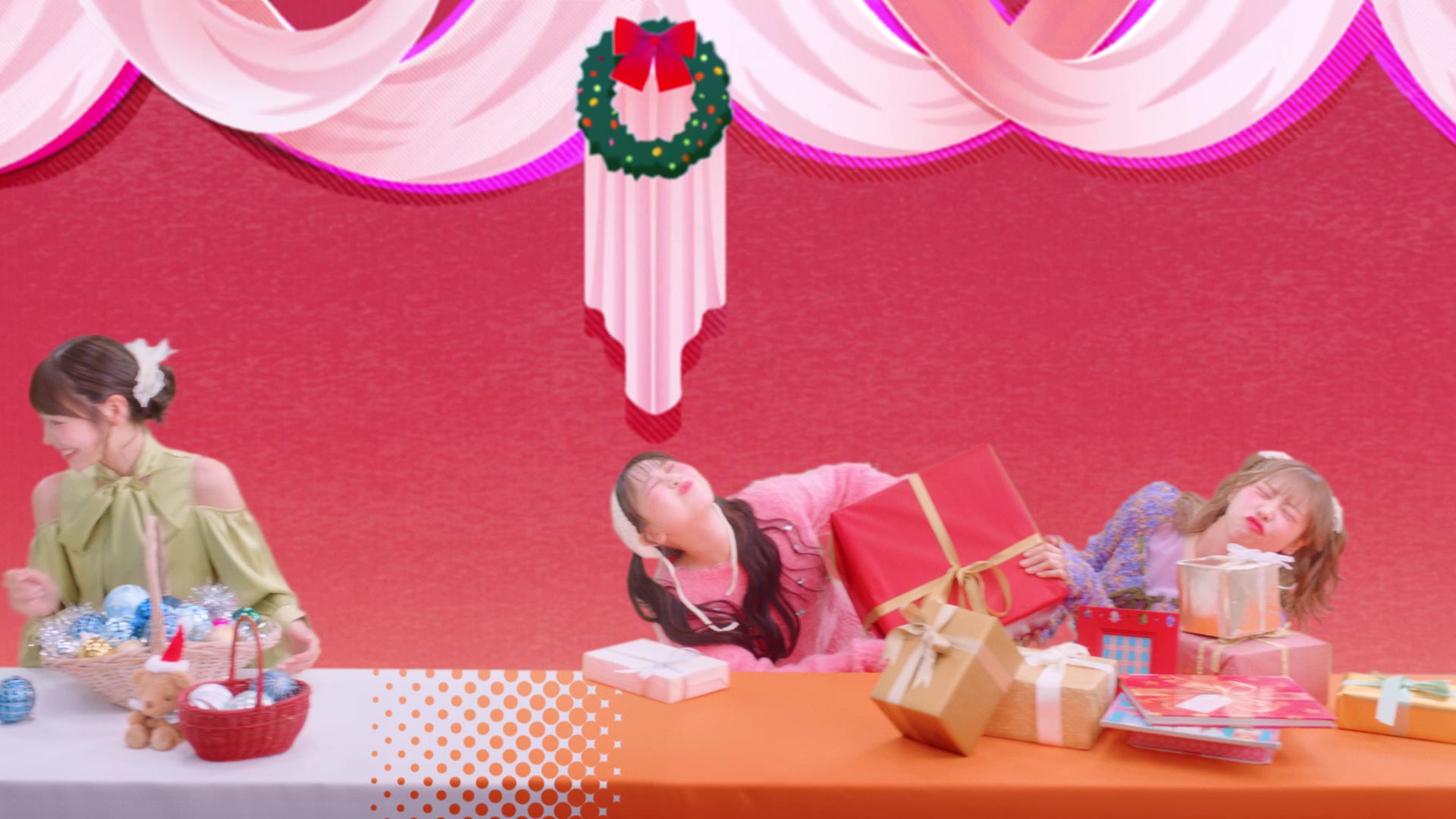 松本さんが真中さんにお菓子を食べさせながらケーキ作りを楽しむ様子や、仲川さんと鎮西さんが背徳ラテで乾杯しながらお菓子パーティーを楽しむ姿が映し出されていきます。さらに鎮西さんが持っていたプレゼントを横に投げると、それを櫻井さんがキャッチ。早瀬さんとのプレゼント交換を楽しむシーンへとつながります。映像がさらに進むと、鎮西さんと櫻井さんが一緒にクリスマスの飾り付けを用意したり、松本さんと仲川さんが大きなプレゼントを取り合うシーンも登場。やがて舞台はクリスマスイブ前日の夜、12月23日へ。準備に疲れて眠ってしまった早瀬さんと真中さんのもとへ、メンバーが駆け寄ります。そしてシーンは、再びパーティー会場へ。全員で「メリークリスマス!」と声を合わせ、動画は締め括られます。