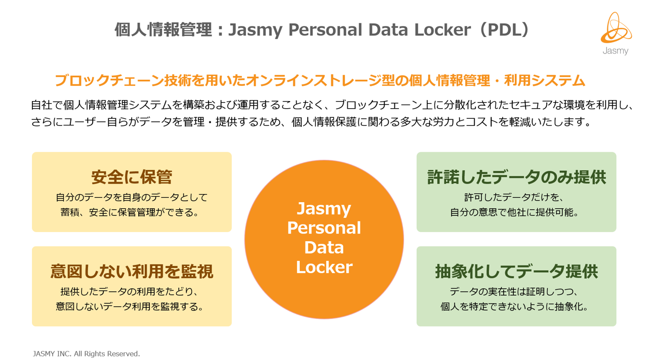 消費者のカーボンクレジットの取得、利用情報はジャスミーのブロックチェーン技術を使った個人情報活用サービスである「Jasmy Personal Data Locker」(以下「PDL」)を活用する事で、安全に保管、利用されます。