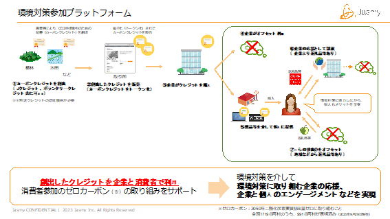 本カーボンクレジット取引所は、カーボンクレジットの流通性の高さとブロックチェーンによる透明性の高い管理環境を活用し、これまで困難だった消費者向けのカーボンクレジット提供やオフセット商品の消費者単位での管理を実現します。