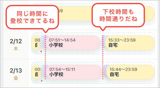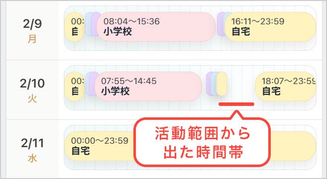 毎日同じ時間に登校しているか、決まった時間に下校しているかなど、日々の通学パターンを直感的に把握できます。また、曜日によって下校時間が異なる場合や、習い事などによって生活リズムが変化する日も、タイムライン上で分かりやすく表示されます。これにより、登校時間が遅れている日や、帰宅時間が普段と異なる日など、日常の小さな変化にも気づきやすくなり、お子さまの生活リズムを継続的に見守ることができます。