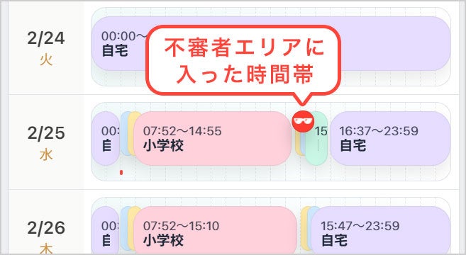 また、本機能では行動が一週間単位で表示されるため、登下校のリズムを俯瞰して確認することができます。これにより、帰宅時間の変化など、普段とは異なる行動にも気づきやすくなります。