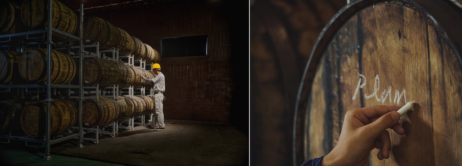 高藏蒸留所ではミズナラ樽をはじめとし、バーボン樽やシェリー樽、ポートワイン樽、ラム樽などをウイスキーの熟成に使用しています。 中でも特徴的なのは、明利酒類の看板商品である「百年梅酒」の熟成を行ったプラムワイン樽。 芳醇な梅酒の香りが染み込んだ樽での熟成により、日本ならではのフルーティな味わいの骨格がつくられます。 600 種類の商品を手がける明利酒類の知見を活かし、個性豊かなウイスキーを造っています。