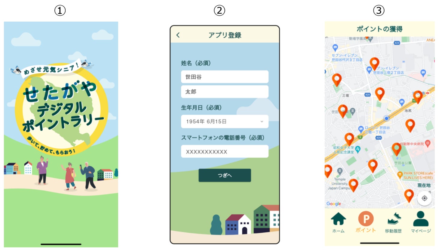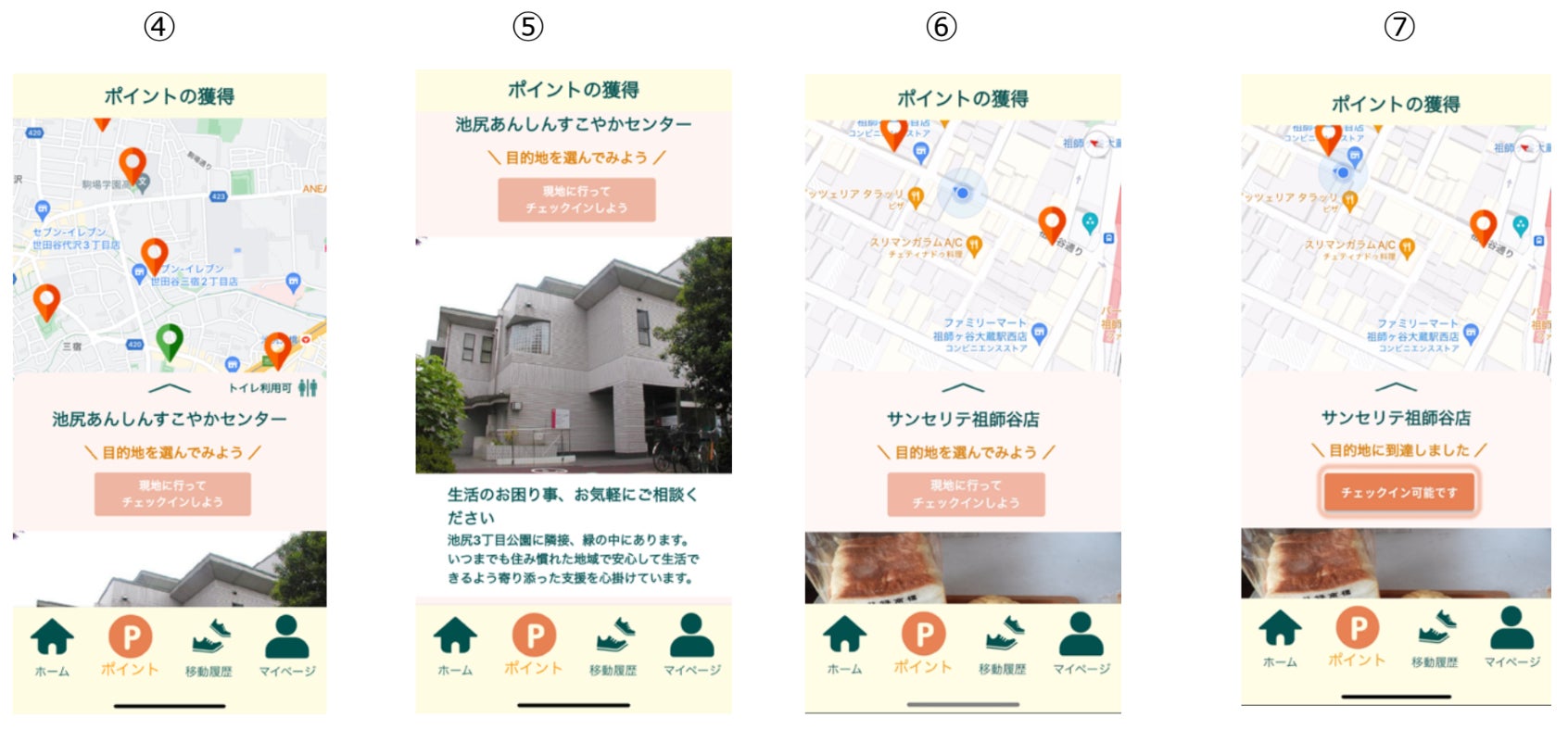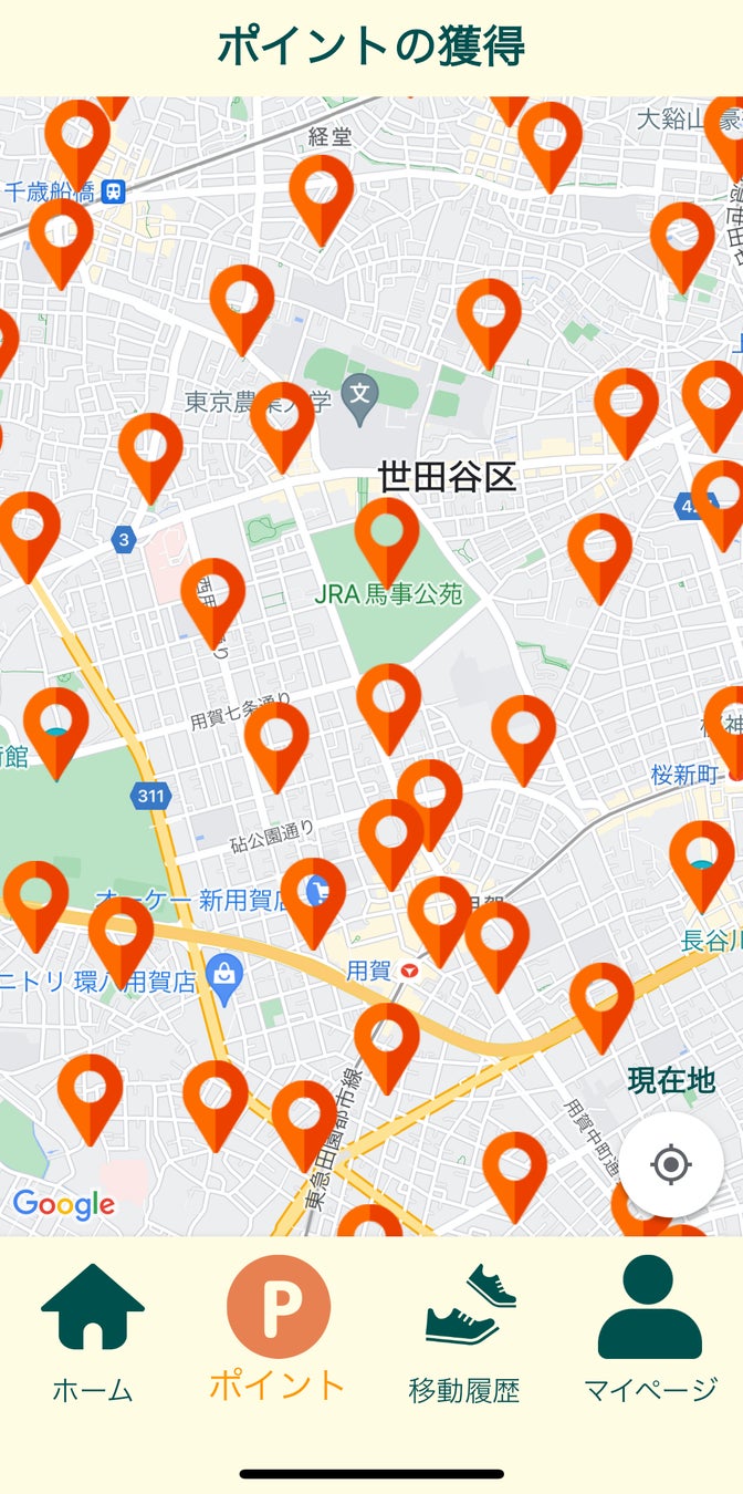 ③ポイント画面 世田谷区内にスポットが約280箇所用意されていることから、気軽に参加できます。