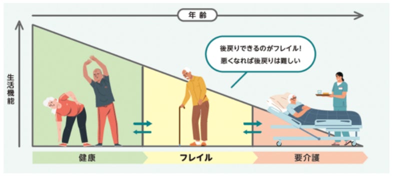 加齢とともに体力や気力が低下し、食欲や活動量が低下し虚弱になっていく状態で、一般的に40歳〜64歳の年齢層である中年期から訪れることが多く、運動、社会参加、栄養摂取など生活習慣の意識を変えるだけで予防できます。