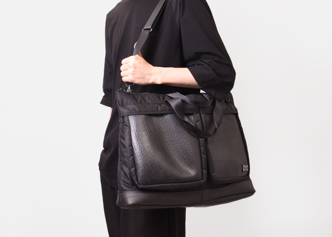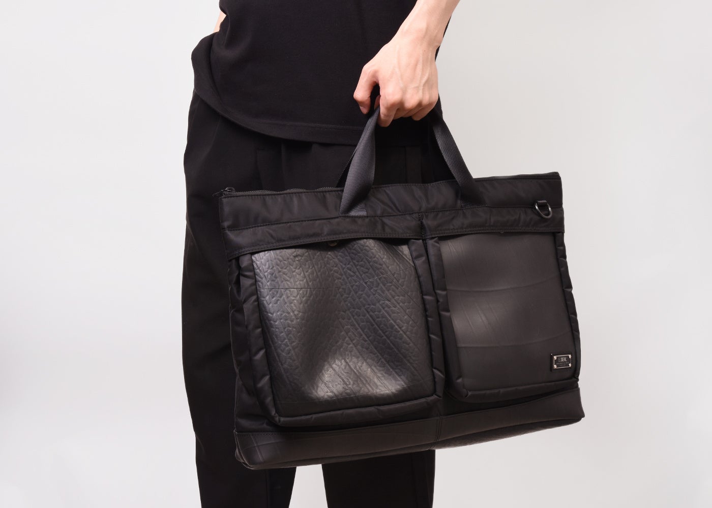 新発売の「2WAY ヘルメット BAG MA-1 model」は、A3サイズの書類や図面などがしっかり入る大容量のメインコンパートメントを備えた2WAY仕様のトートバッグです。正面と下部から底面にかけては廃棄タイヤチューブを使用し、それ以外の部分にはMA-1に使用されるナイロンツイルをリサイクルナイロンにアップデートした生地を使用。これにより、大容量のトートバッグながら重量1kgの軽さを実現。底面のチューブにより状態の悪い地面に直接置いても気にならず、耐久性と使い易さを兼ね備えたアイテムです。