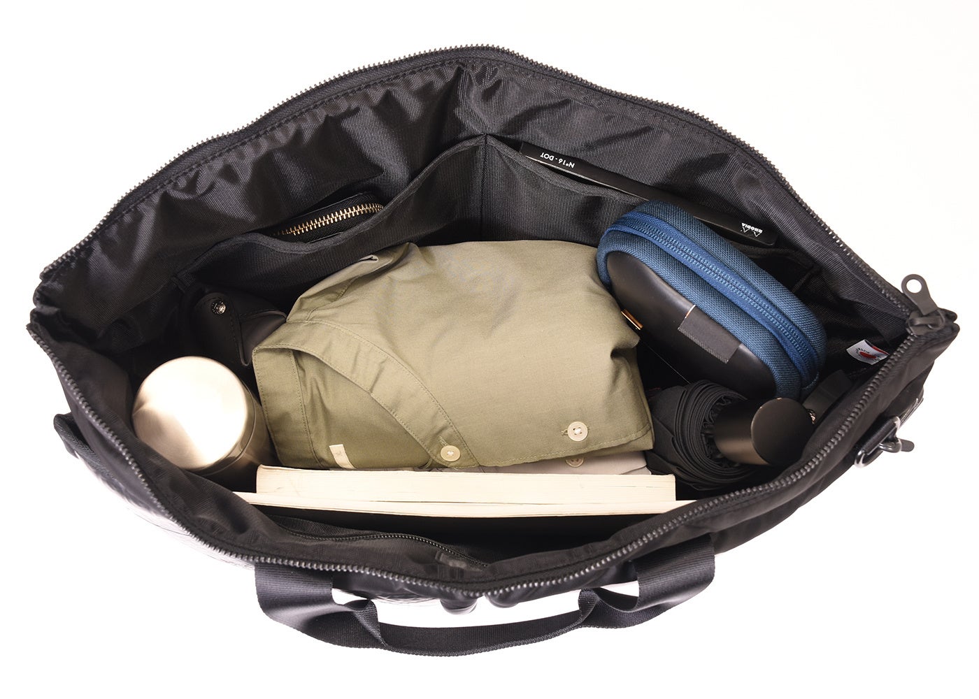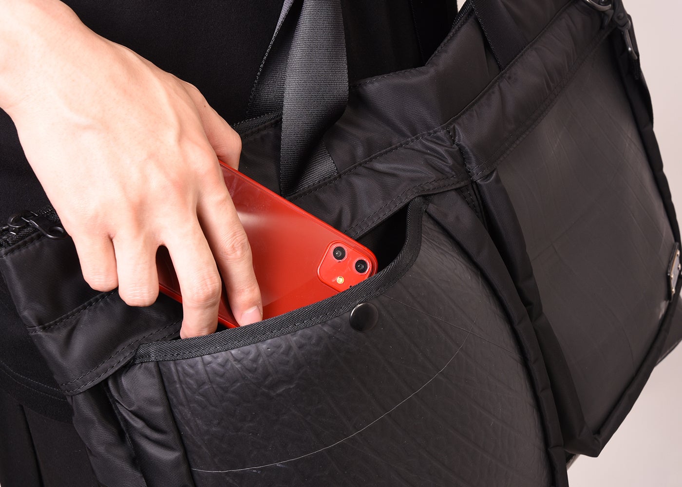 手持ち・ショルダーで使用でき、オールシーズンどんな場面でも活躍します。メインポケットはヘルメットが丸ごと入るほどの見た目以上の収納力があり、フロントにあしらわれた2つの大きなポケットも小物類をまとめて収納する時に便利です。