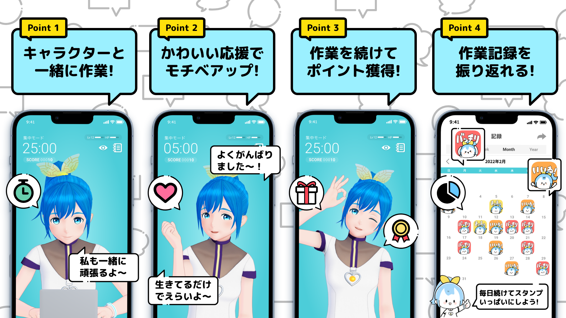 コロナ禍でテレワークやリモート学習、創作活動などひとりで作業する機会が増える中、ひとりで作業する人にキャラクターが寄り添い、疲れている時に励ましてくれたり頑張ったら褒めてくれることで、日々の作業を楽しく続けることができます。