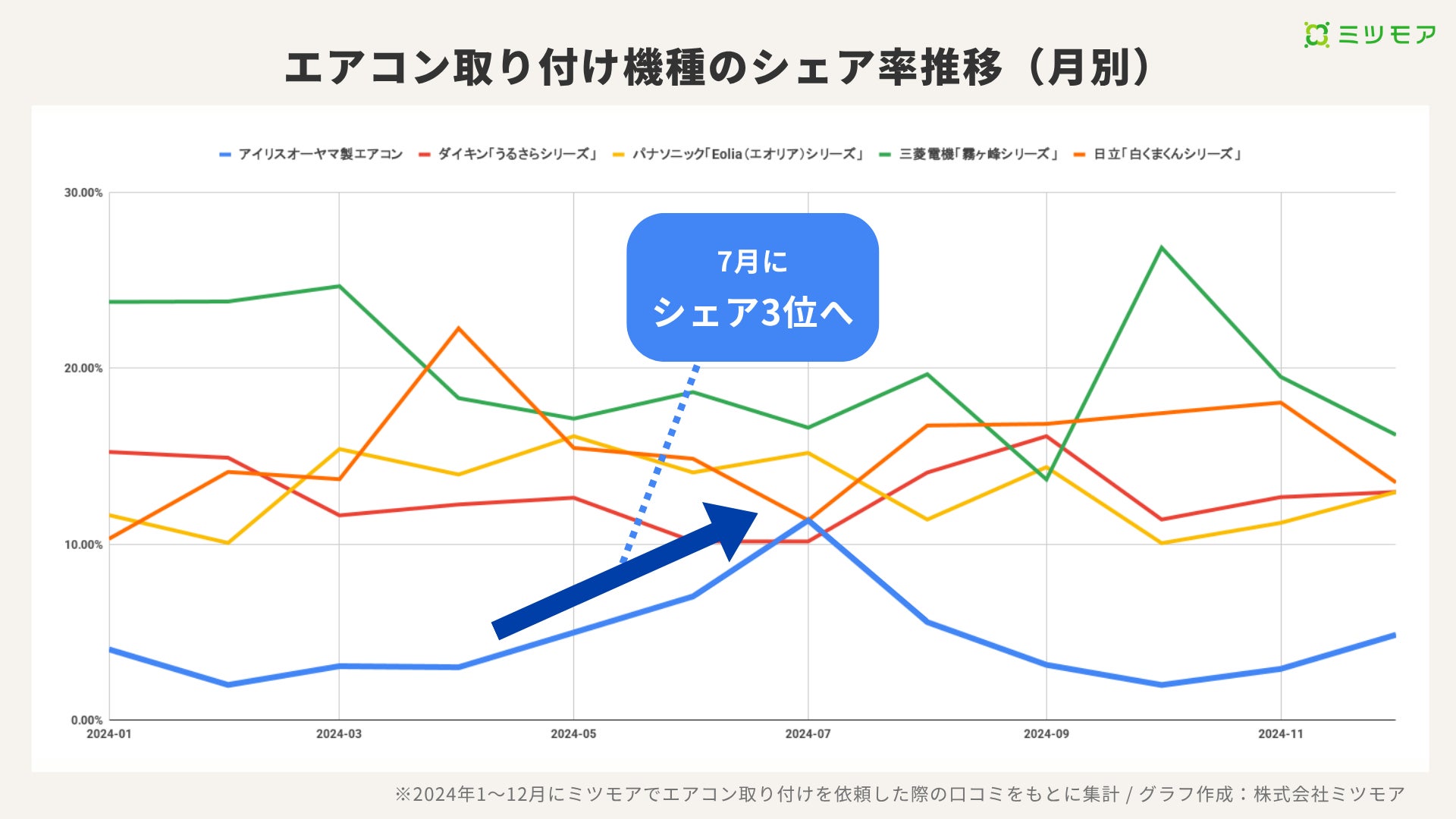 7月の“猛暑特需”でアイリスオーヤマ取り付け依頼シェア急上昇3位。夏のエアコン人気機種TOP5をミツモアが調査