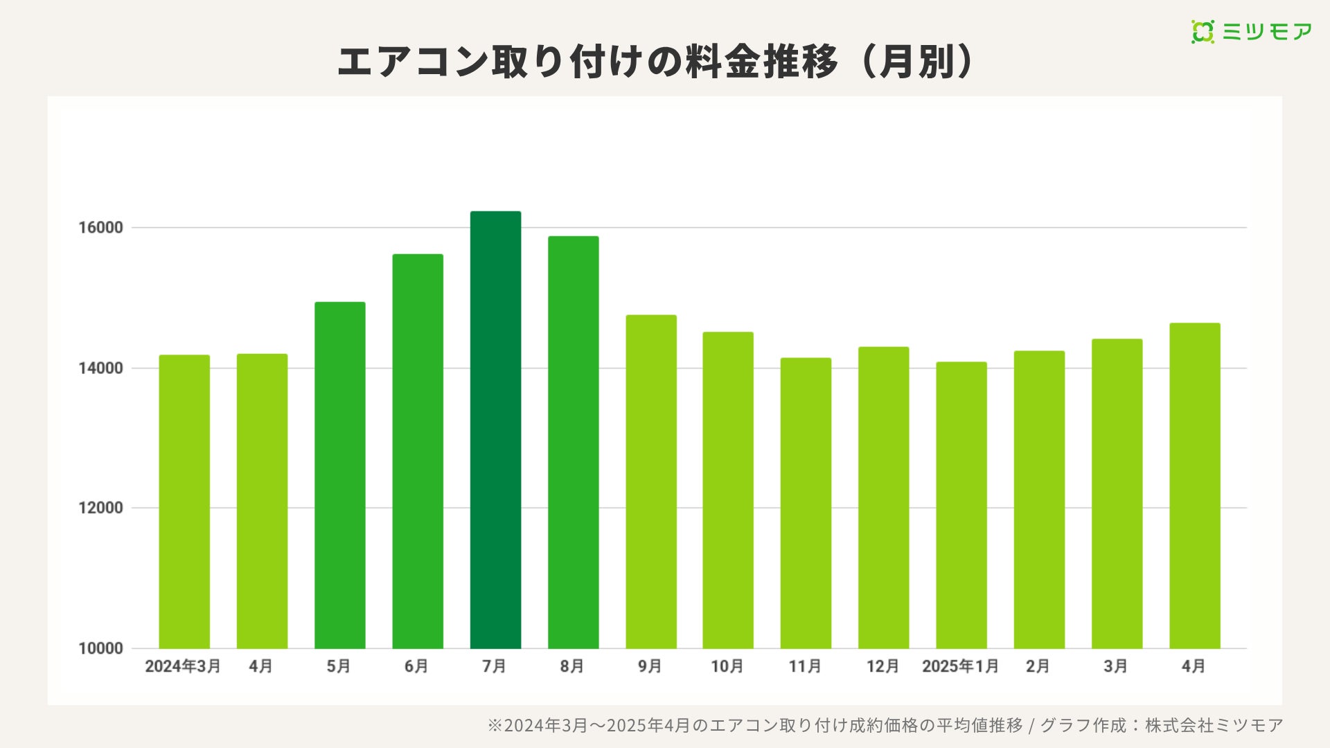 エアコン取り付け料金は需要の集中する7月に最も高くなります。2024年は、4月の平均成約費用が約14,208円、5月は14,941円、6月は15,621円、7月は16,232円でした。 今夏は例年より暑くなる予報が出ており、エアコン設置業者の混雑が予想されます。需要が立て込むと工事が遅れることも少なくないため、設置や交換予定のある方は早期に相談することをおすすめします。