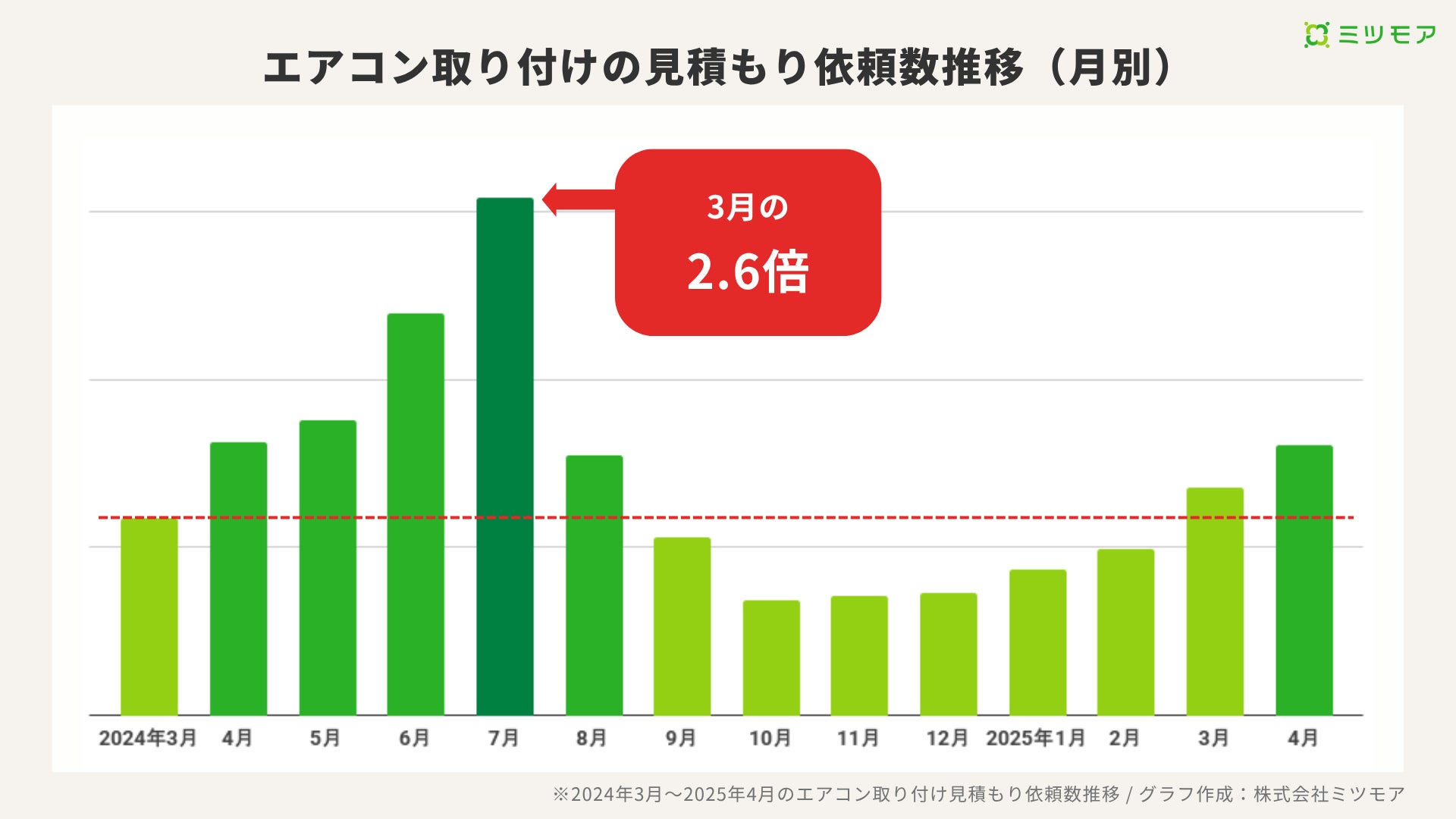 2024年のエアコン取り付け依頼は7月に最も集中し、3月と比較して2.6倍の需要が発生しました。これは夏季の気温上昇に伴い、消費者のエアコン設置ニーズが急激に高まったことを示しています。