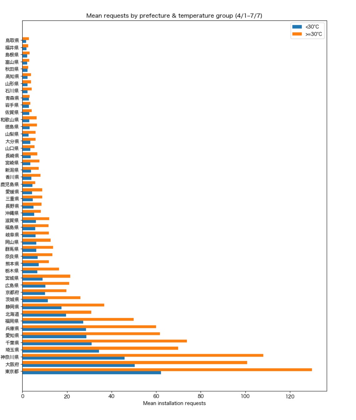 調査対象: 「ミツモア」で行なわれたエアコン取り付けの見積もり依頼、気象庁の過去気温データ(各都道府県、県庁所在地の最高気温を参照)