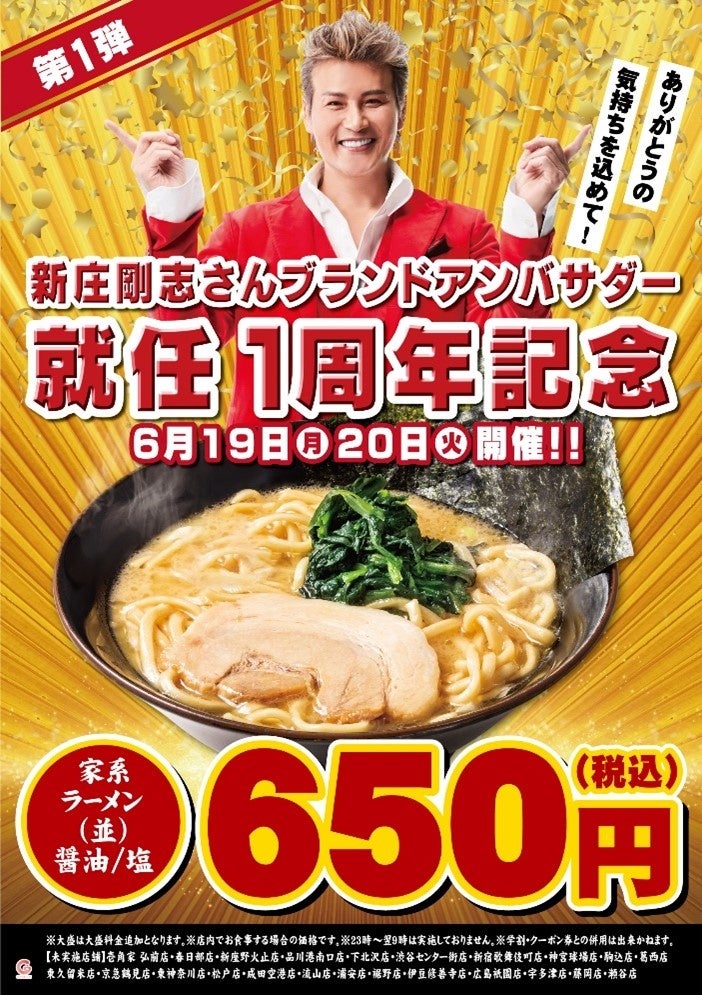 新庄剛志さんブランドアンバサダー就任1周年記念キャンペーン壱角家 2日間限定で『家系ラーメン並(醤油/塩)』を税込650円で提供