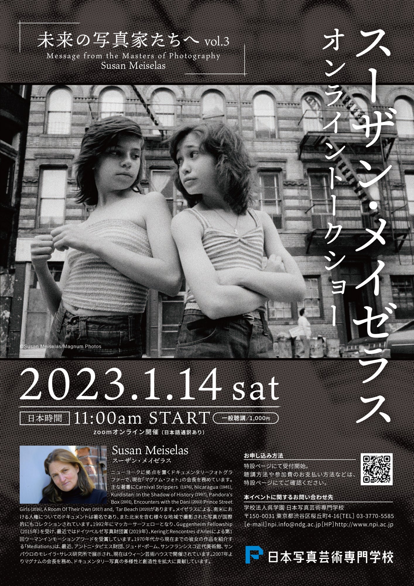 渋谷に開校して57年目となる日本写真芸術専門学校が、アメリカを代表するドキュメンタリー写真家 スーザン・メイゼラスのオンライントークショー(ZOOM配信)を2023年1月14日(土)に開催。それに合わせて、本校講師の授業動画を一般公開します。