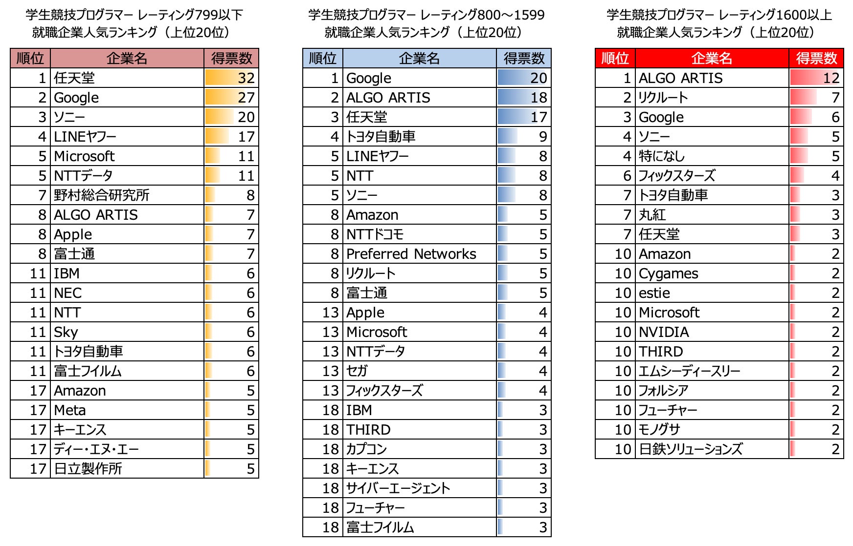 ※「①就職企業人気ランキング」は、「AtCoder」を除いた得票数2以上の企業を記載しています。