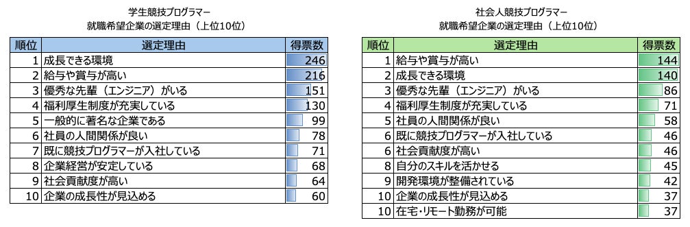 学生・社会人ともにGoogleがトップ。昨年と同様、高い報酬、成長できる環境、優秀な先輩エンジニアがいる環境を選ぶ傾向が明らかに。