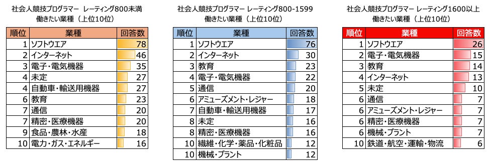 AtCoderレーティング別では、学生・社会人ともに、レーティングが高いほど「既に競技プログラマーが入社している」が上位にランクインしています。