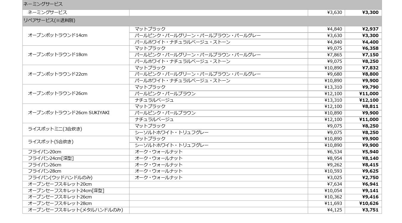 さらにオーブンポットラウンドのマットブラックについては、画期的な製造改善が可能となり、最大25%程度の値下げをした新価格にて販売いたします。