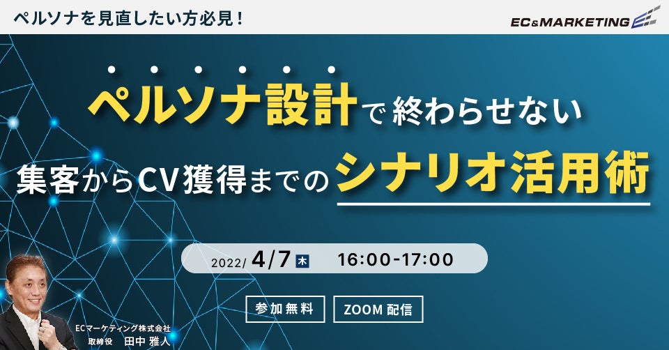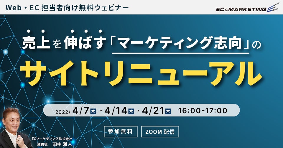 Webマーケティング支援サービスを展開しているECマーケティング株式会社(本社:東京都港区 代表取締役社長:中山高志)は、Web・EC担当者向けに「マーケティング志向」のサイトリニューアルをテーマにした無料ウェビナーを4月7日・14日・21日に開催いたします。
