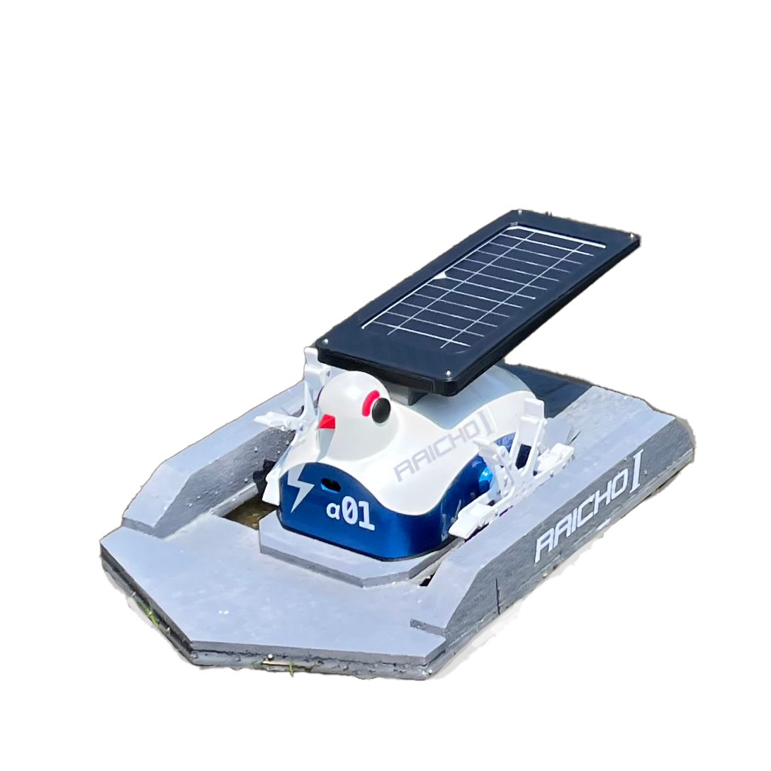 稲の成長を妨げる雑草の抑制を目的とした自律移動ロボットです。底面に付いたヒレ状の脚を動かして水を濁らせ、雑草の光合成を妨げることで雑草の成長を抑制します。単純な動き(例:前進→右旋回→前進→左旋回)をランダムに行うようプログラミングしており、複数台を同時に稼働することで効率的に隅々まで撹拌することが可能です。