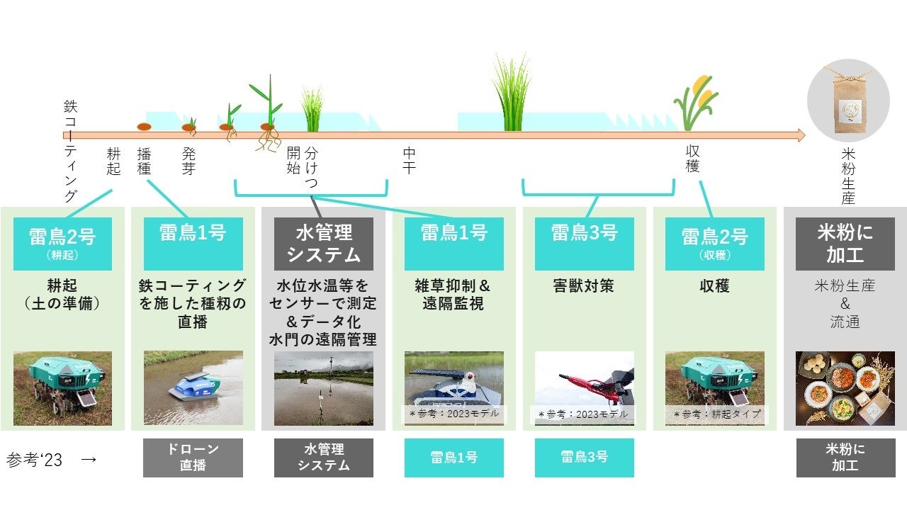 テムザックは、雑草抑制のみならず、稲作にかかわる各作業(耕起・播種・害獣対策・収穫等)のロボット化を進めており、2025年を目途に農業ロボット「雷鳥シリーズ」のラインアップを一通り完成させる予定です。また、収穫したコメは米粉にして「雷粉」の名称で流通させることで収益性を高める取り組みも行っています。条件不利地の耕作放棄地拡大の歯止めとなることを目指して、省力化を追求する米作りの実践、米粉の魅力発信と流通網の構築、そしてロボットを使った新たな「稲作サービス」の仕組みづくりに取り組んでまいります。