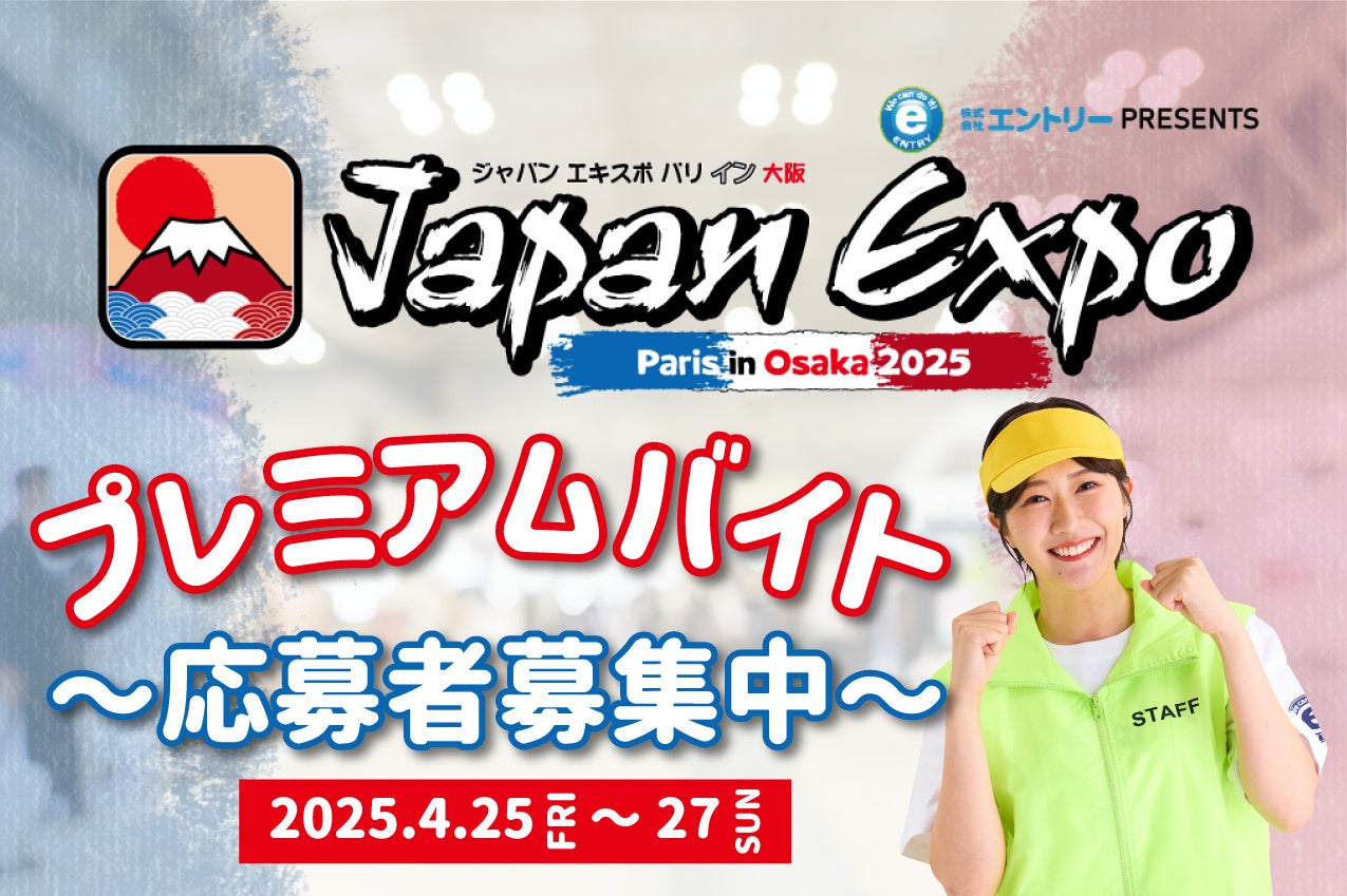 “人と仕事の縁むすびに挑戦し続ける”を企業理念に、主にお仕事紹介サイト「スマジョブ」やお仕事マッチングサービス「シェアジョブ」を運営する株式会社エントリー(本社:東京都新宿区、代表取締役:寺本潤、以下エントリー)は、2025年4月26日(土)・27日(日)に開催される「株式会社エントリー presents Japan Expo Paris in Osaka 2025」において、「プレミアムバイトスタッフ」の募集を2025年3月28日から開始することをお知らせします。