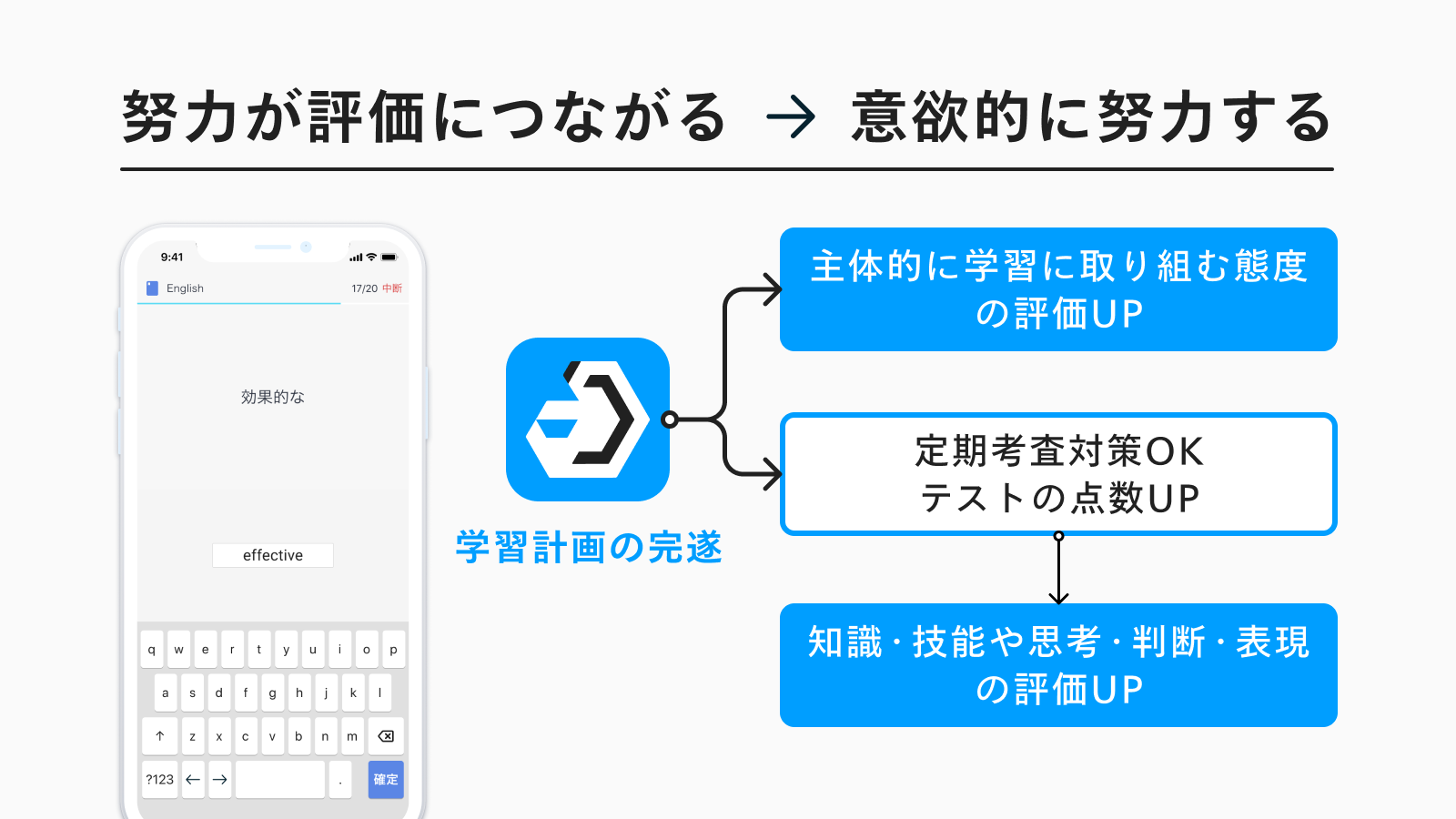 Monoxerを活用して計画的に学習を進めるプロセスにおいて、自分にとって苦手な項目を生徒各々で自己調整をする機会になると判断いただいています。また、学習を進める上で繰り返し「解いて憶える」プロセスが粘り強い取り組みにあたるとして、柏原高校では「主体的に学習に取り組む態度」の評価の一部に組み込まれています。