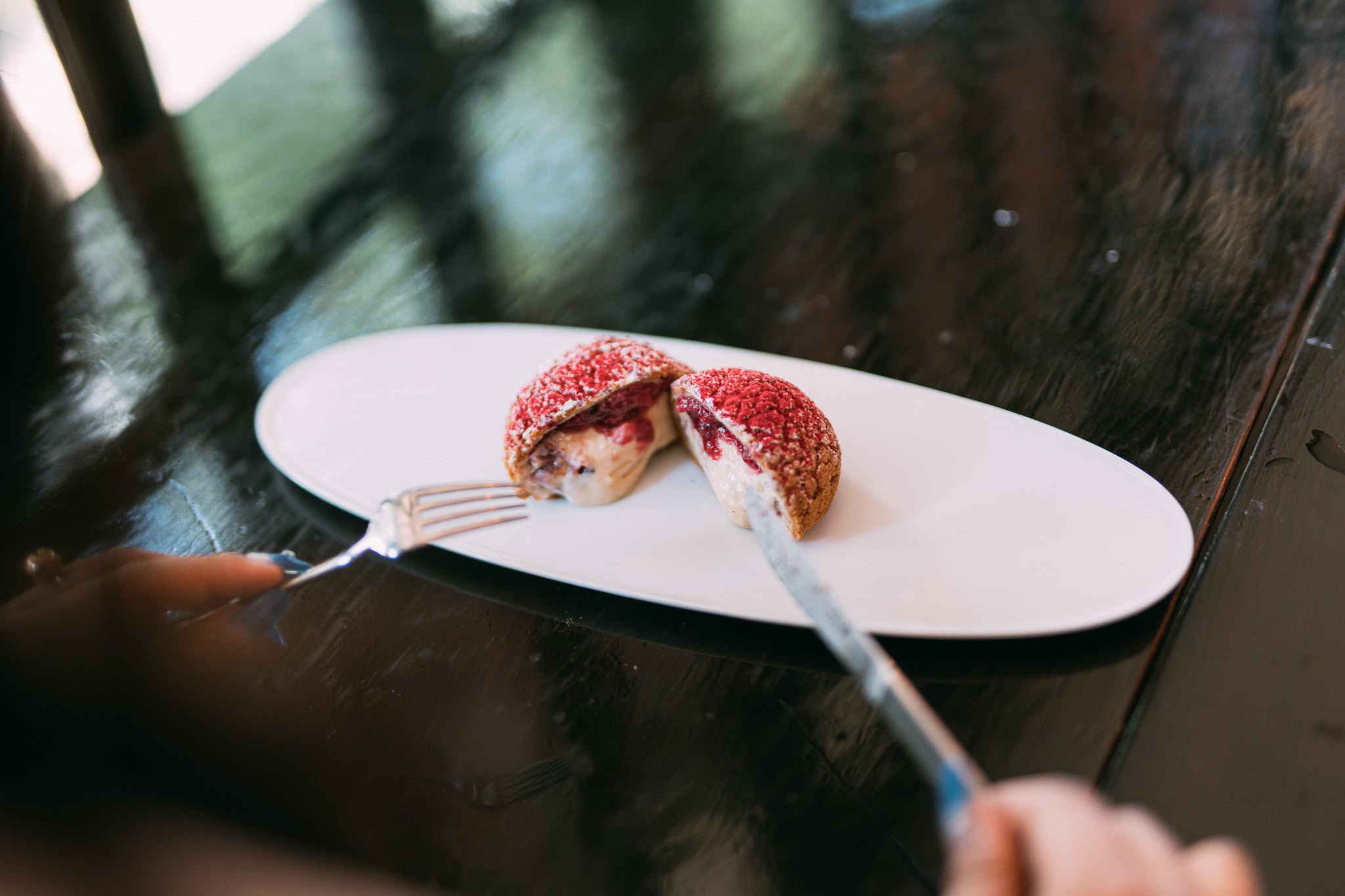 農薬不使用で香り高い食用バラは、その栽培難易度の高さから非常に希少。ミシュラン星つきレストランやホテルをはじめとする高級店を中心に使用されています。1枚の花びらが40円に近いものもある高級な食材です。この香り高い高級食用バラのB品でバラジャムをつくることで、体験しやすい価格帯のバラのシュークリームを実現。バラの味はなかなか想像がしづらいですが、前回は行列のまま完売し、香りのあるバラのおいしさを、150名の方々と共有することができました。今回はそのバラジャムを増量。よりリッチさを増した香りの体験を用意させていただきました。