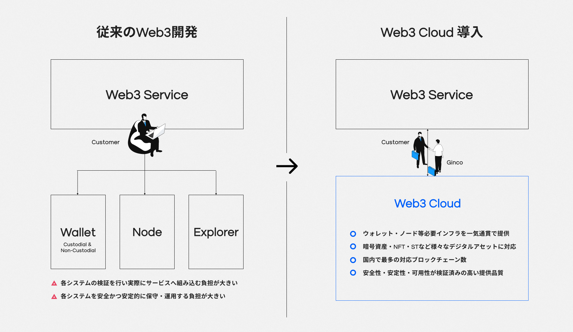 デジタルアセットを扱うWeb3サービスでは、ウォレットやノード、エクスプローラーといったブロックチェーン特有のシステムを構築しサービスに組み込む必要があります。これらのシステムは複数の事業者やコミュニティによって個別に提供されていることが多く、それぞれのシステムを検証し繋ぎこんで開発を行う必要があり、企業がWeb3サービスを構築する際の負担や障壁となっていました。また、サービス提供後においても複数システムの管理を行う必要があるため、保守運用における負担増にも繋がります。