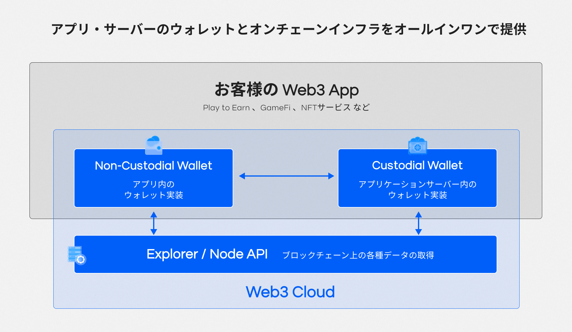 例えば、Play to EarnやGameFi、NFTサービスなどを開発する際には、下図のようにアプリ・サーバーのウォレットとオンチェーンインフラをオールインワンでご利用いただけます。
