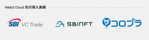 これまで多くの企業にご利用いただいてきたインフラサービスを統合し、Ginco Web3 Cloudとしてサービス提供を開始するに先んじて、10月26日に発表したSBI VCトレード株式会社がSBINFT株式会社と共同開発する「SBI Web3ウォレット」や、株式会社コロプラに採用されています。