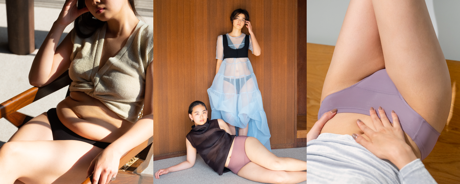 Nagiは、わたしたちの身体ともっとうまく付き合うために生まれた、1枚でも過ごせる吸水ショーツです。吸水機能や防水機能に加え、防臭機能、制菌効果(菌を減らす効果)のある機能素材を使用しています。防水布を折り返す独自の積層構造は、特許出願中です。