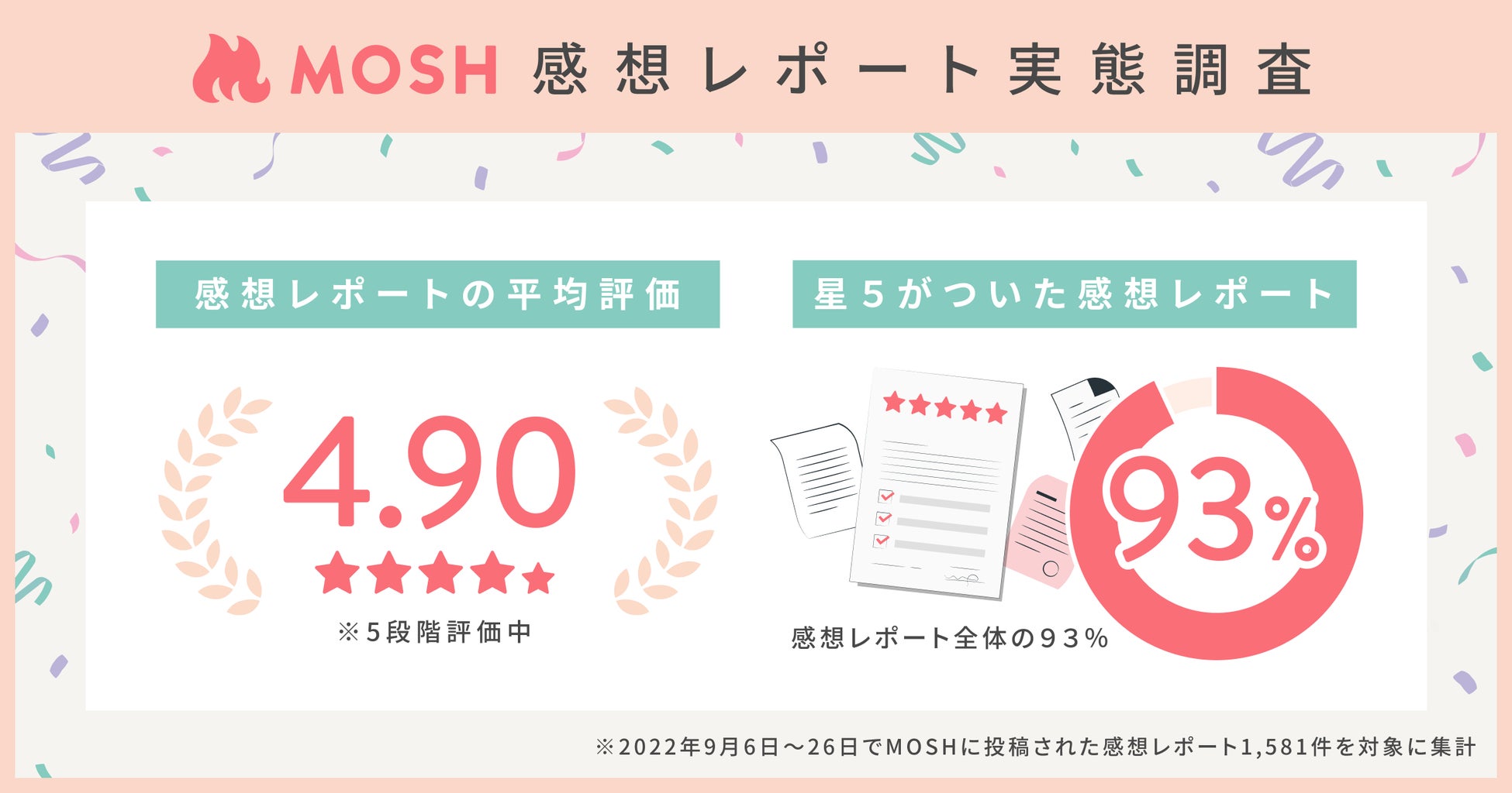 9月6日のリニューアル以降から9月26日までにMOSHへ寄せられた感想レポート1,581件を調査したところ、平均評価が5段階中4.90に達し、満点である星5の評価を獲得した感想レポートは全体の93%という結果が得られました。
