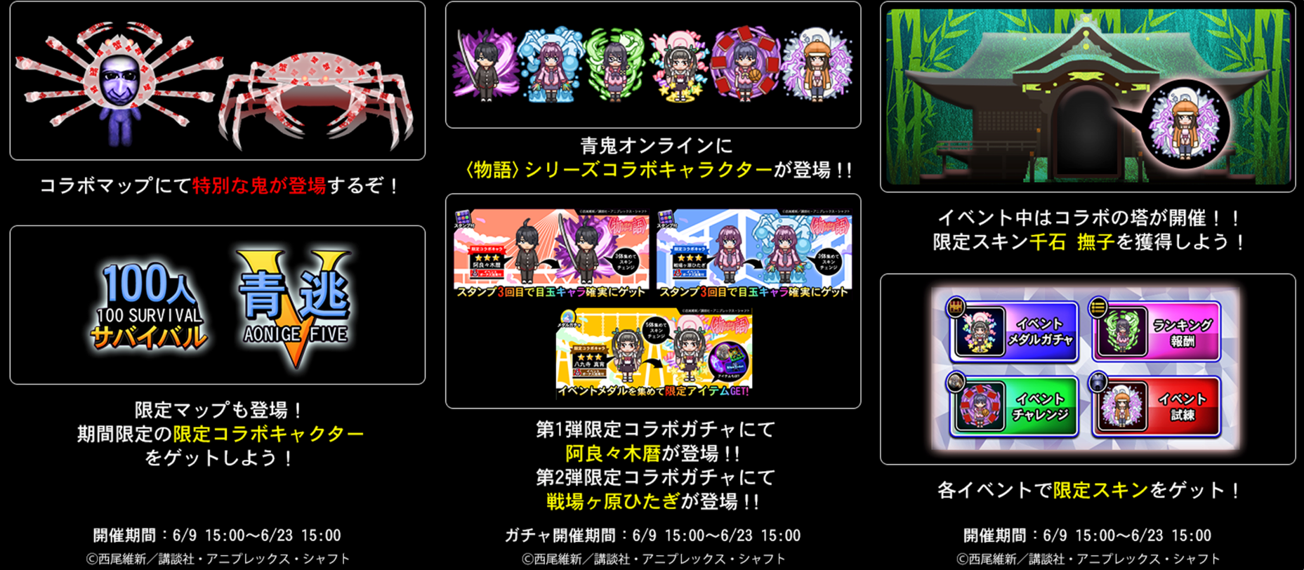 株式会社GOODROID(本社:東京都目黒区、代表取締役社長:松田和彬)は、最大100人のキャラクターが青鬼から逃げ回るマップの中で最後の一人として生き残ることを目指すオンライン・サバイバルゲーム『青鬼オンライン』にて、『アニメ「〈物語〉シリーズ」』コラボイベントが6月9日15:00より開始したことをお知らせいたします。