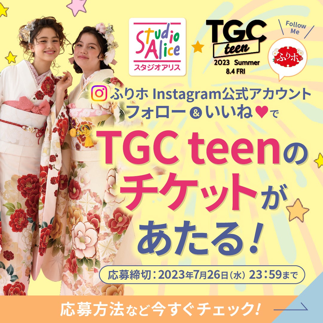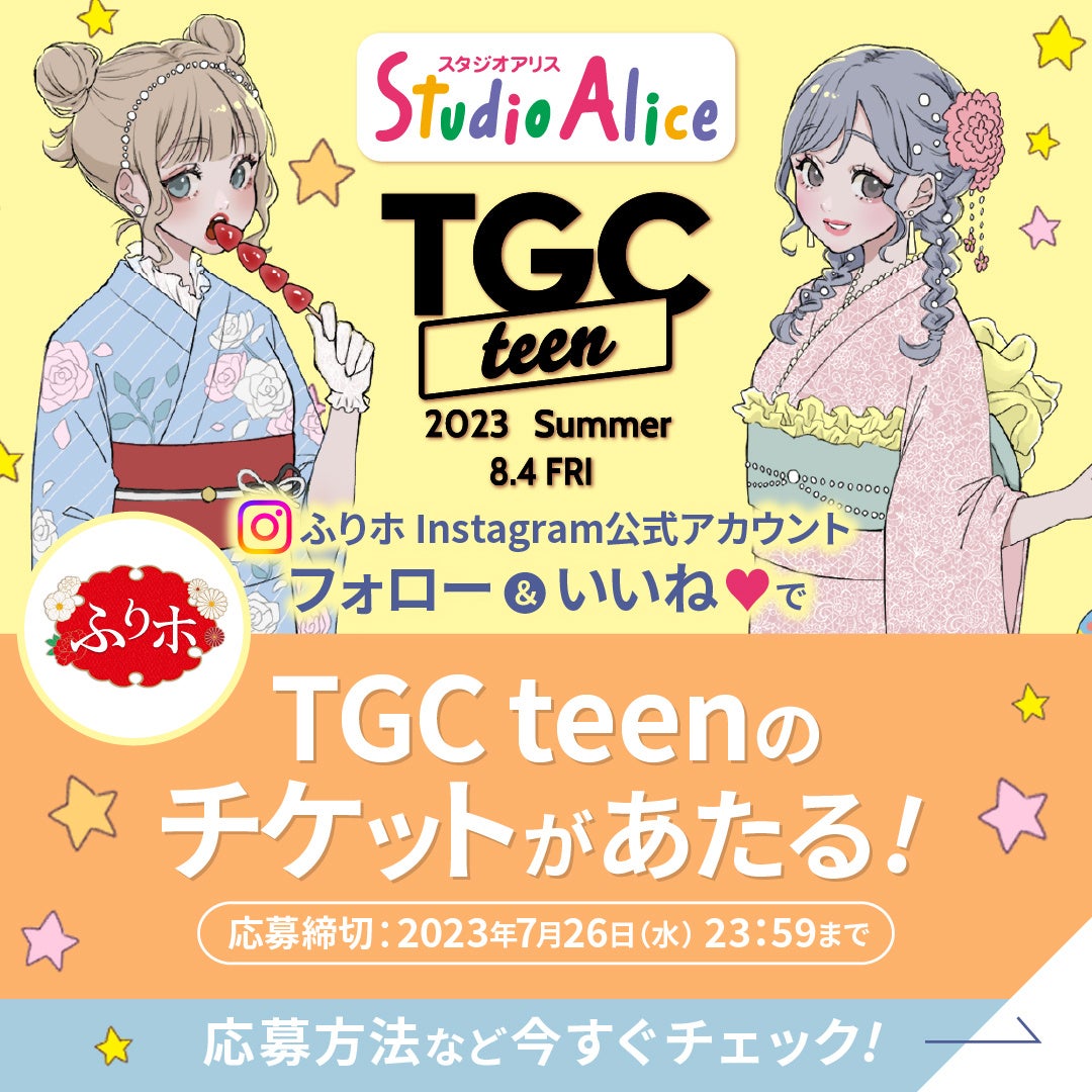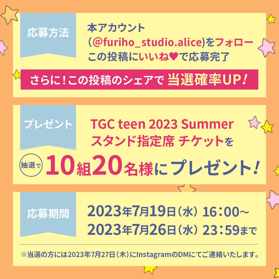スタジオアリスのふりホInstagram公式アカウントをフォロー&いいねすると、TGC teen 2023 Summerのスタンド席チケットが抽選で10組20名様にあたるキャンペーンがスタート。