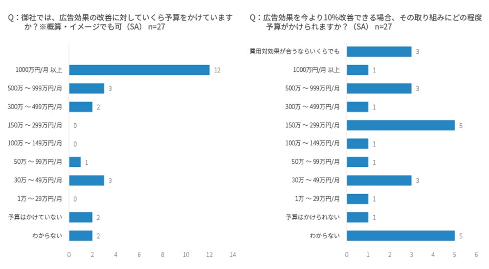 「広告効果を今より10%改善できる場合、その取り組みにどの程度予算がかけられますか?」については、回答にばらつきがあり、すでに大きく予算投下をしており、あまり追加投資する考えは見られない結果でした。