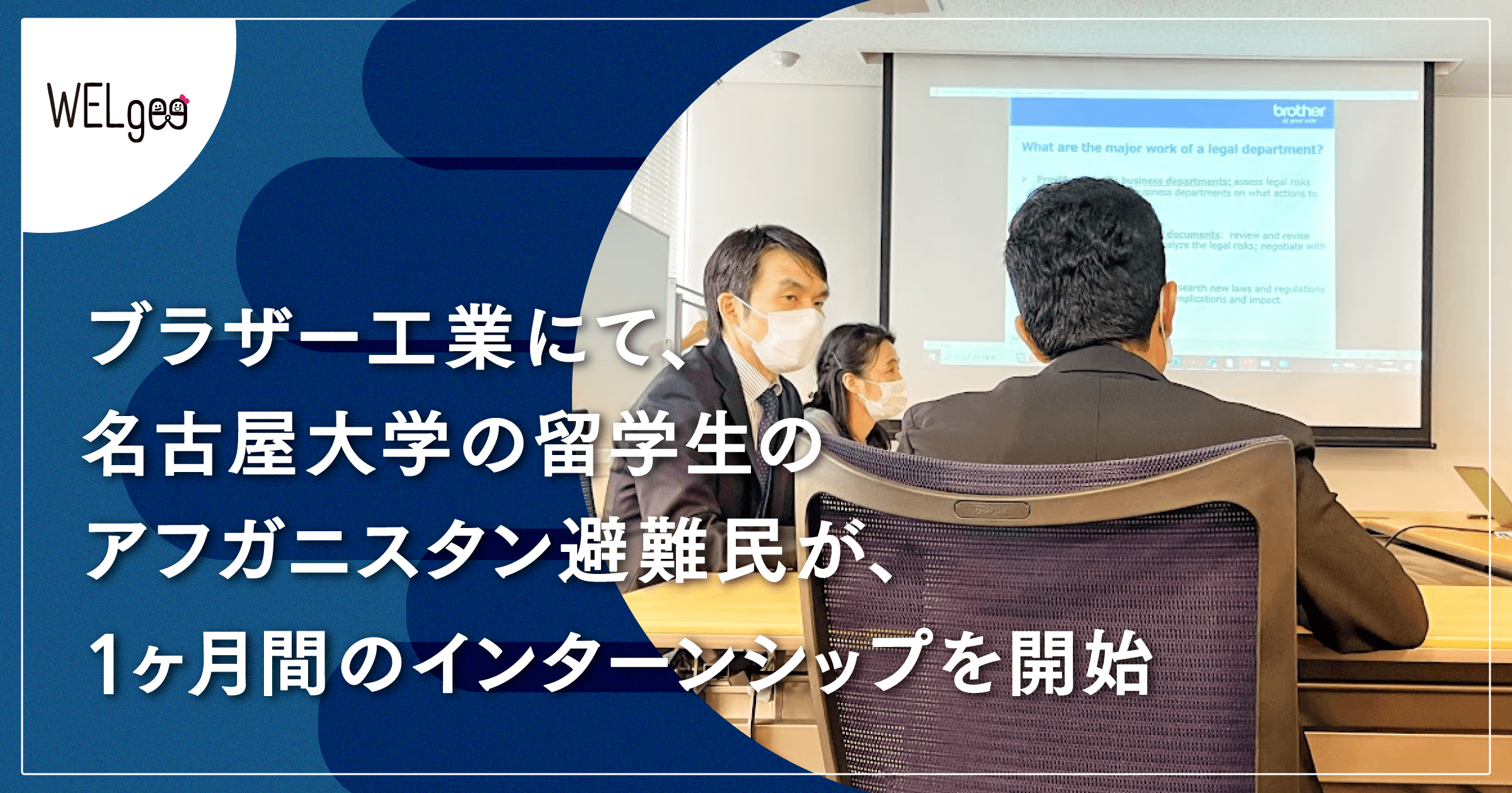 WELgeeが伴走をするMさん(仮名)はアフガニスタンの大学で法律と政治学の学士号を取得し、名古屋大学でガバナンスと法律の修士号を取得しました。帰国後、日本での学びを生かしながら、母国で都市開発に法務から携わっていましたが、タリバン政権奪還と本政権の人権侵害行為をうけ、昨年再来日しました。ブラザーは、Mさんに企業法務経験や法律家の経験を期待し、ブラザー工業 法務・環境・総務部 法務グループにてインターンシップの受け入れを決めました。