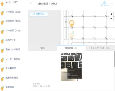 作業終了後に設定した検査ピンのステータスを「完了」にすることで、関係者は場所や時間を問わずリアルタイムに現場の進捗を確認することができます。