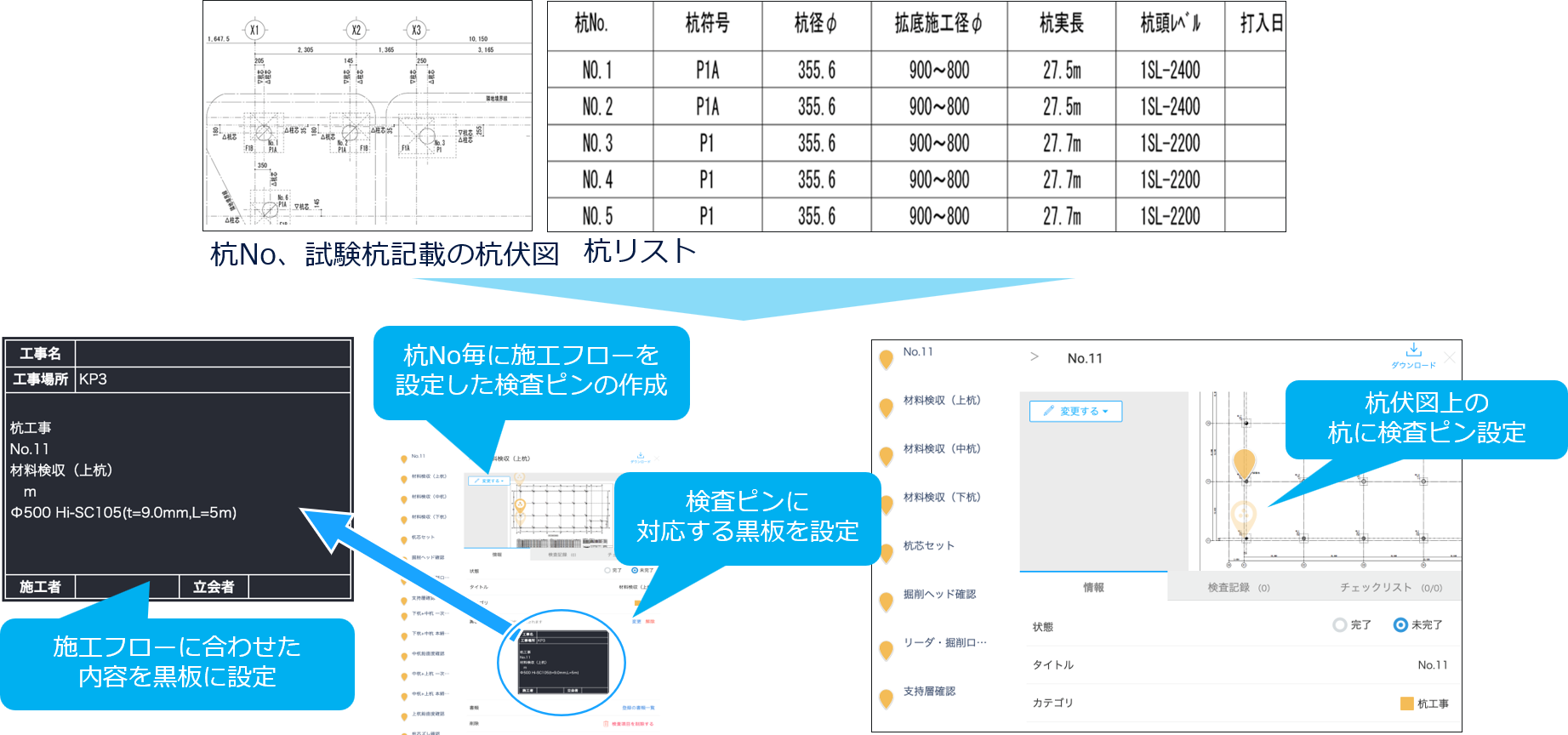 黒板を設定した検査ピンを図面に記載されている杭ナンバーの箇所に配置します。同じ箇所に複数の黒板を設定できるため、打設時の作業手順に従い検査ピンを作成できます。