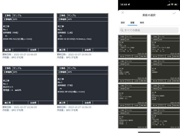 構造図(杭Noや杭状図、杭リストなど記載)から必要な黒板を自動で読み取り、杭リストや手順に合わせた大量の黒板を事前に作成することが可能です。事前に作成した黒板はモバイルアプリからいつでも呼び出すことが出来ます。
