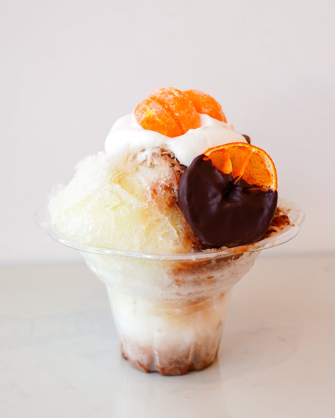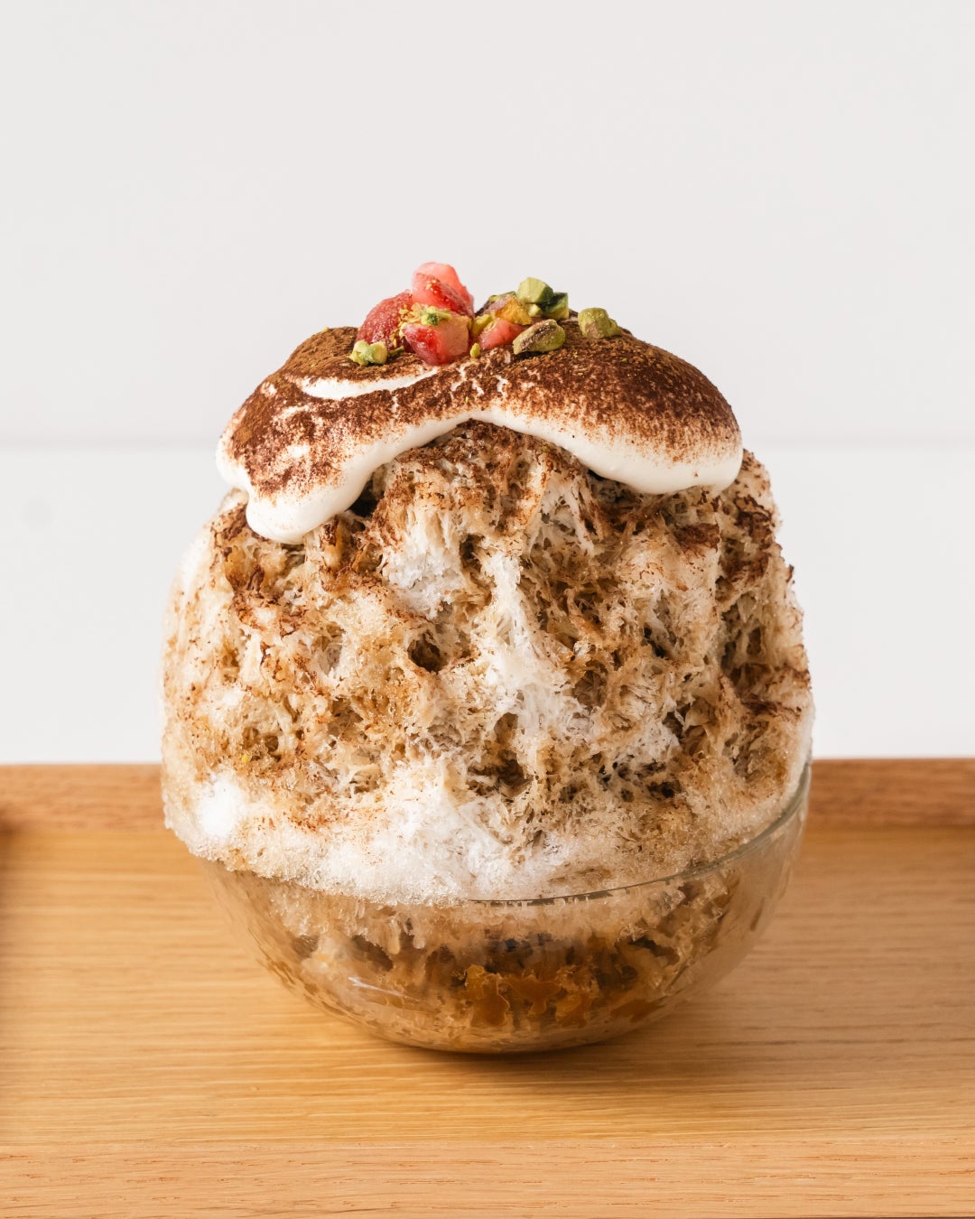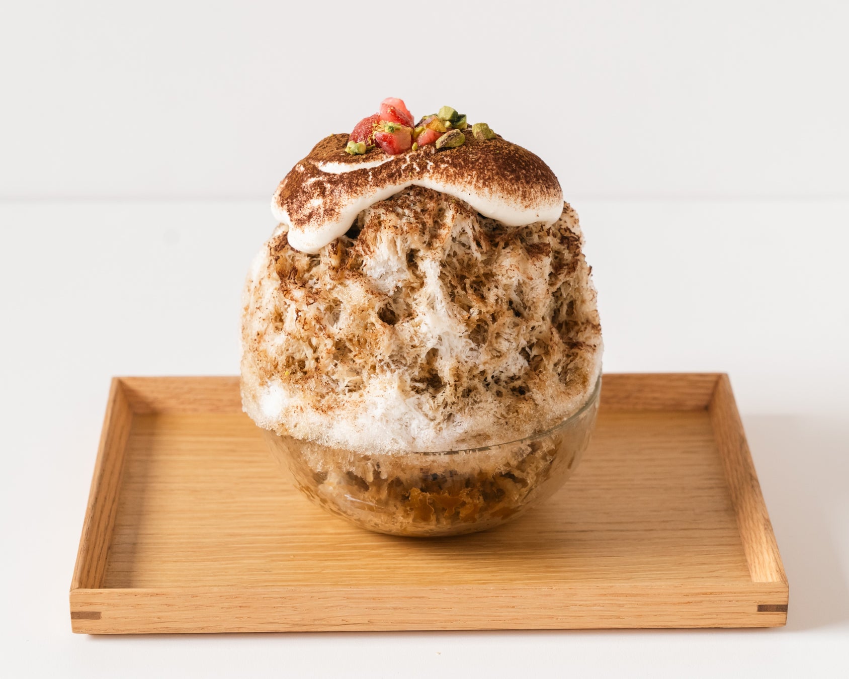 土づくりからお茶を育て商品化し、カフェも展開している「はじまりの紅茶」。茶葉を知り尽くした同店が手掛けるのは、じっくりと煮出したオリジナルのロイヤルミルクティーシロップと相性の良いメロンのペアリングを活かした茶氷。柔らかいかき氷にみずみずしいメロンシロップと果肉を組み合わせ、もちっとしたわらびもちをトッピングしました。