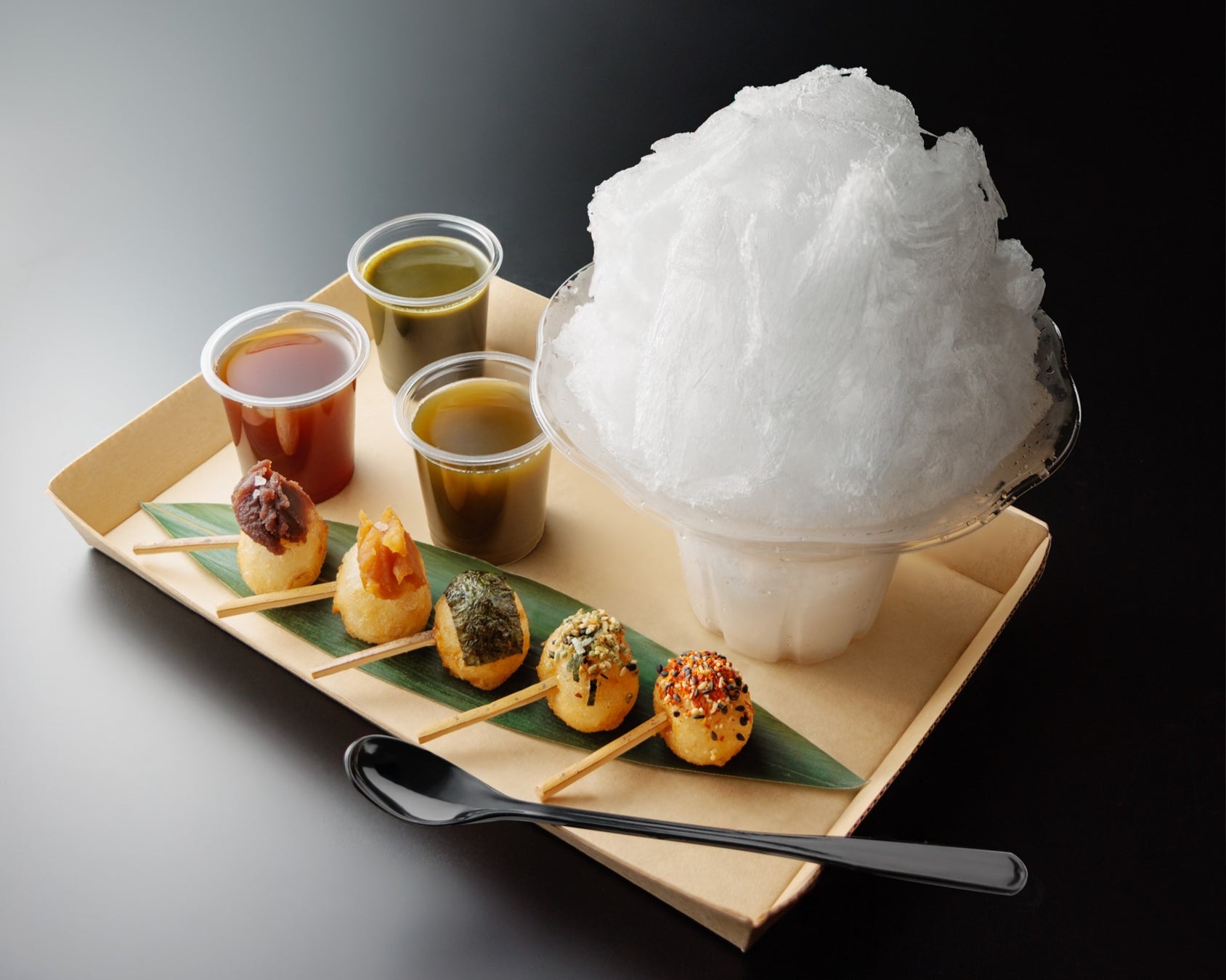 藤枝市産抹茶・島田市産和紅茶と煎茶を使用した自家製シロップの茶氷。同店の人気 NO.1 商品「揚げ団子」もセットでお楽しみいただけます。塩あんこ・塩キャラメル・揚げいそべ・えごま唐辛子・わさびの揚げ団子 5 種を食べ比べできます。