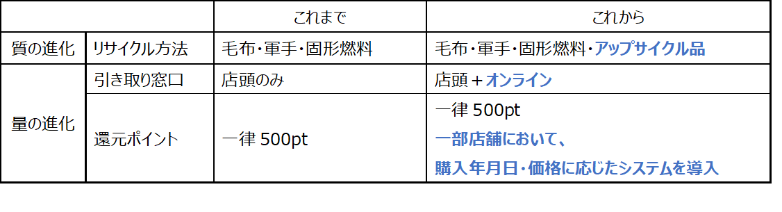 さらに、衣料品の回収率を向上させるために、新たな回収システムを導入します。具体的には、これまでは店頭のみで行っていた衣料品の引き取りをオンラインにも拡大します。特に、店頭引き取りにおいては、新しいきめ細かなポイント還元システムも導入します。