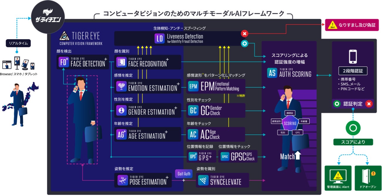 株式会社ワイヤードパッケージ社が開発するコンピュータビジョンのためのマルチモーダルAIプラットフォーム「TIGEREYE COMPUTER VISION FRAMEWORK SOLUTION」は、 高い認証精度を保ち、リアルタイム認証を可能にしたマルチモーダルAI認証フレームワーク、複数のコンピュータビジョンAIを用いて高度な認識技術(物体・人物・姿勢・行動認識)や認証技術(顔認証・歩容認証)、感情、年齢、性別などの推定を行ないます。
