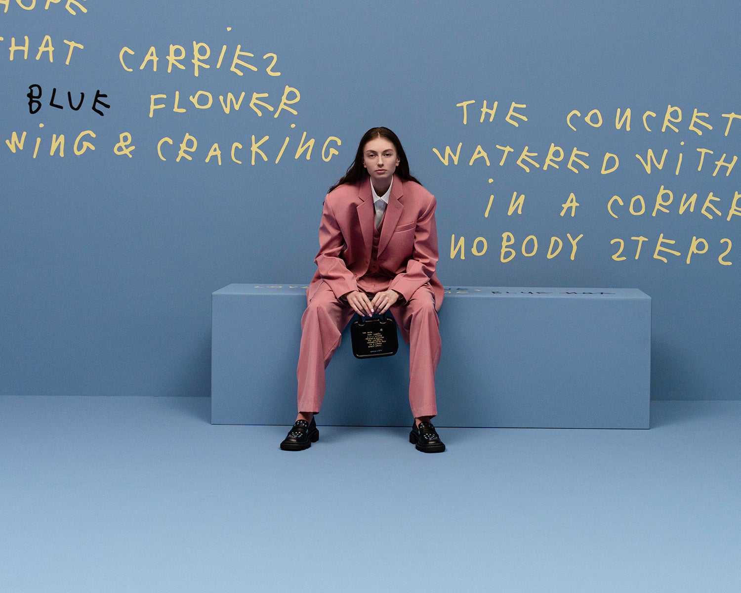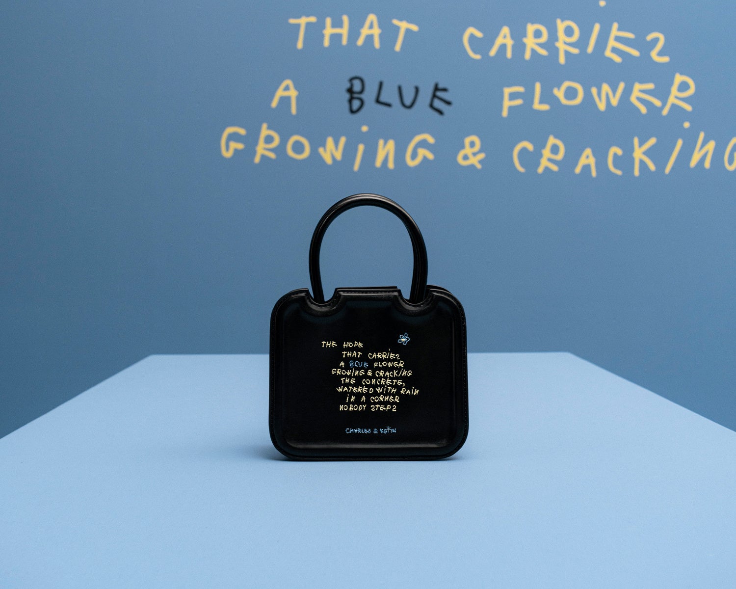 彫刻的なデザインの「スカルプチャートートバッグ」には、コンクリートの中に咲く一輪の青い花という希望に満ちた物語が記されています。不揃いのステッチは、コレクションに自発性とパーソナルな要素を与え、すべてのバッグとシューズが、着用者のために特別に作られたかのように感じさせます。オールブラックに映えるハンドライティングの文章は、キャピタンの言葉の奥にある静かな輝きに思いを馳せ、会話のきっかけとなるようなデザインです。