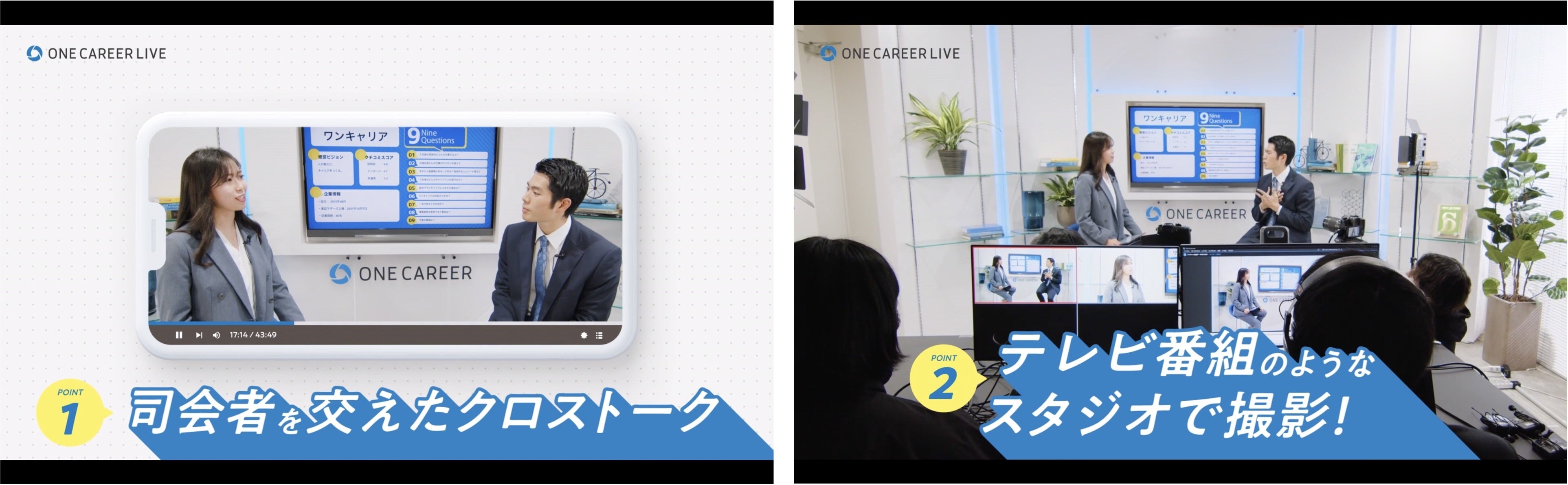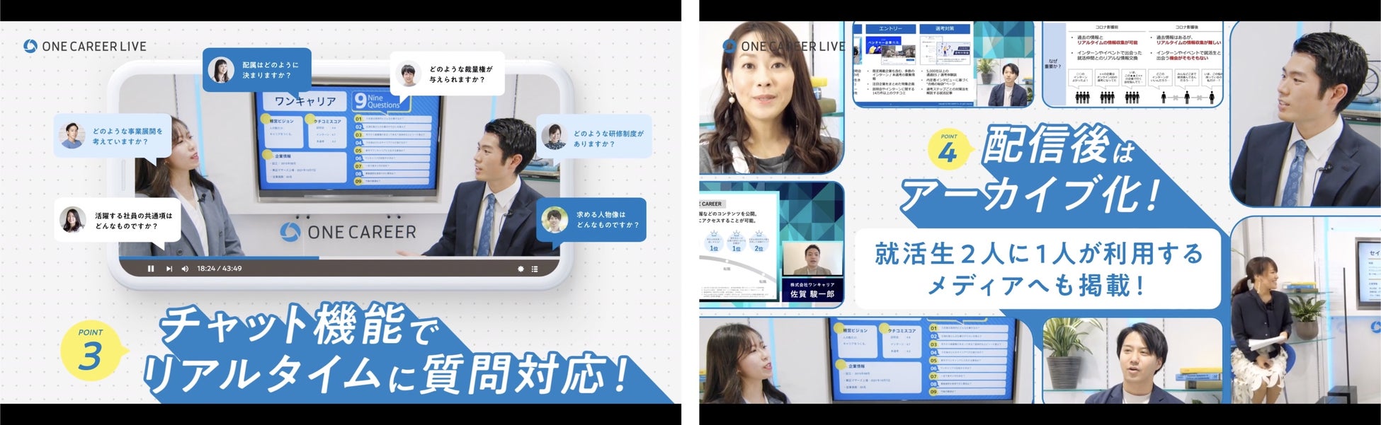 そこで、「採用動画を対話型へ」変える、ワンキャリアライブの説明に入ります。ワンキャリアライブの4つの特徴「司会者を交えたクロストーク」、「テレビ番組のようなスタジオでの撮影」、「チャット機能でリアルタイムに質問対応」、配信後のアーカイブ化についてご紹介します。