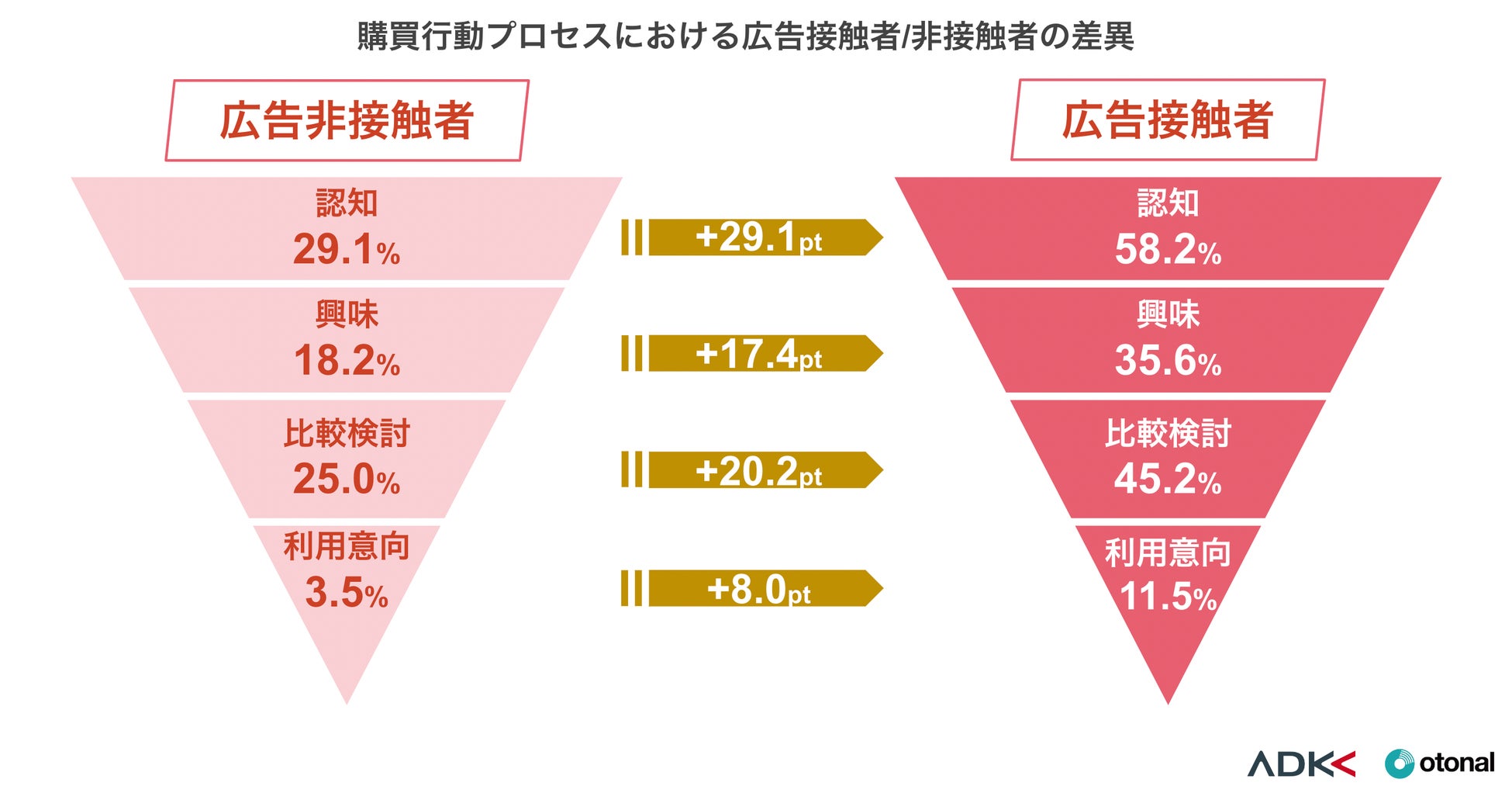 1)音声広告は、消費者の購買行動プロセスのそれぞれのフェーズ(認知、興味関心、比較・検討、利用意向)において、高い効果をもたらすことが明らかになりました。特に「認知」は、広告の非接触ユーザーよりも2倍高くなっており(29.1ポイント増)、同サービスの音声広告が効果的であることが実証されました。