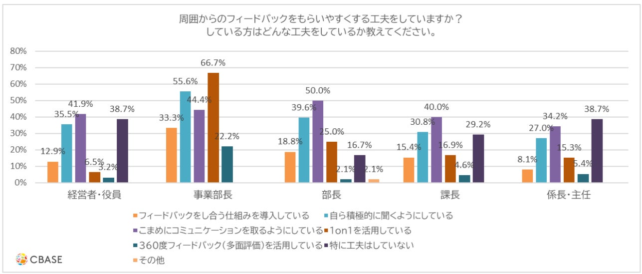 一方で、他の役職の回答では、「フィードバックをし合う仕組みを導入している」「1on1の活用」「360度フィードバックの活用」といった、会社に導入されている仕組みの活用がフィードバックに関しては十分ではない傾向も明らかになりました。特に「係長・主任」では「特に工夫していない」が最も多い回答となり、まだ周囲からのフィードバックを組織に活かしていく取り組みを行えていないことがわかります。多くの人材育成や組織開発ツールが存在する中で、目的をどこに置いて運用するかは役職別の意識の差も課題として存在しているようです。