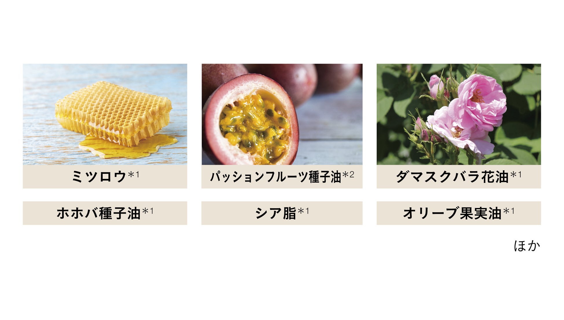 ベースに純度の高いミツロウを採用。ダメージを受けやすい肌を保護すると注目されるパッションフルーツの種子油*²など、厳選した15種類のエモリエントオイルをバランスよく配合。美容液のような贅沢レシピで、うるおいに満ちた美しい肌へ。